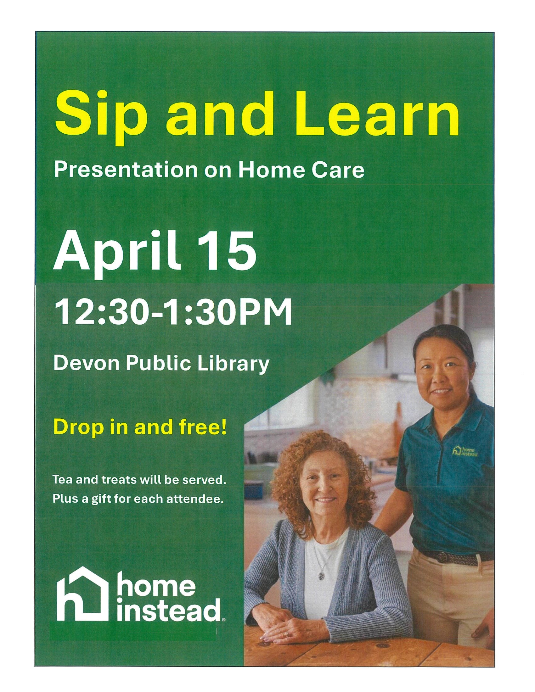 Sip and Learn Wednesday, April 15: 12:30-1:30pm Drop in for this free presentation on Home Care, with Home Instead. Tea and treats will be served, plus a gift for each attendee. |