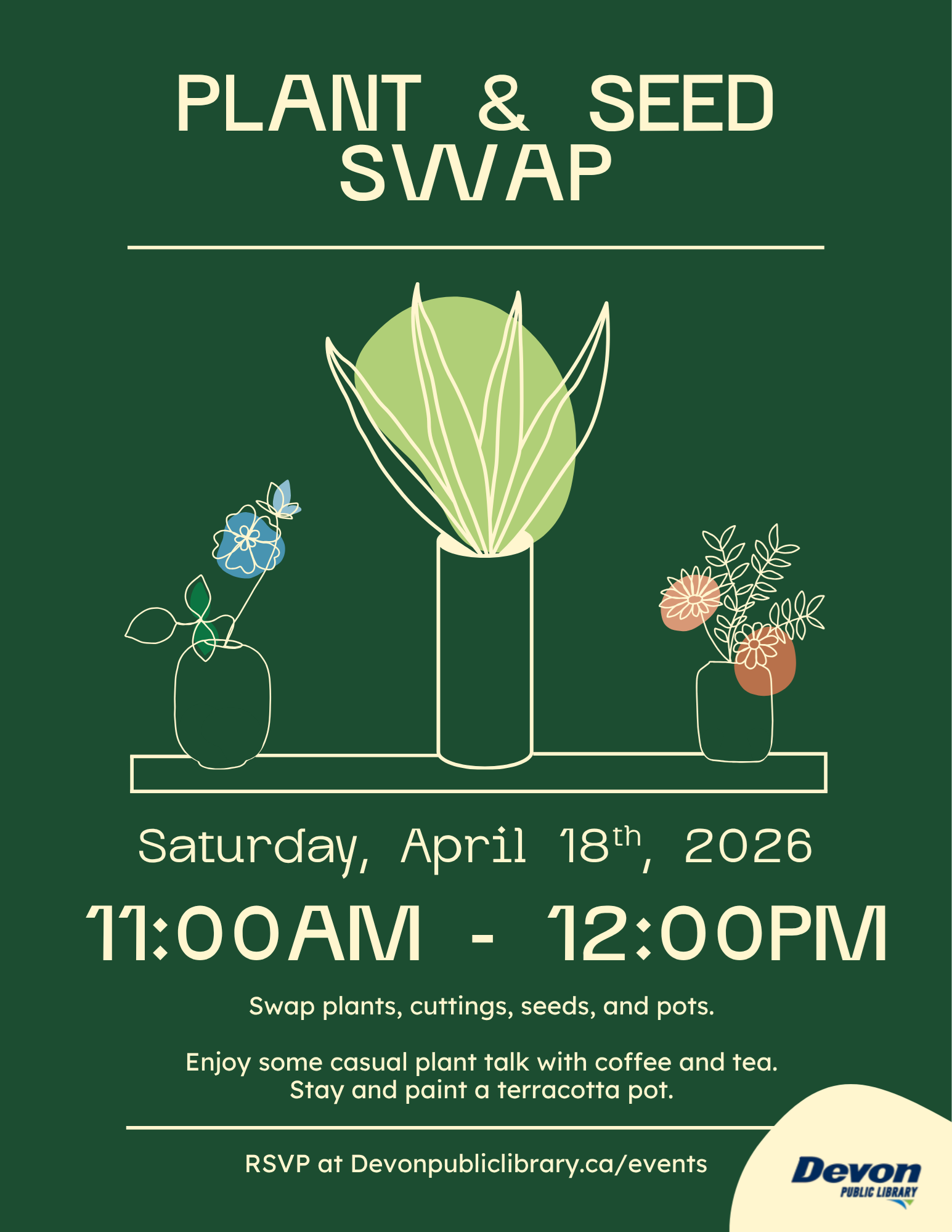 Plant & Seed Swap Saturday, April 18: 11:00am-12:00pm Drop in and swap plants, cuttings, seeds and pots! Enjoy some casual plant talk with coffee and tea. Stay and paint a terracotta pot. |