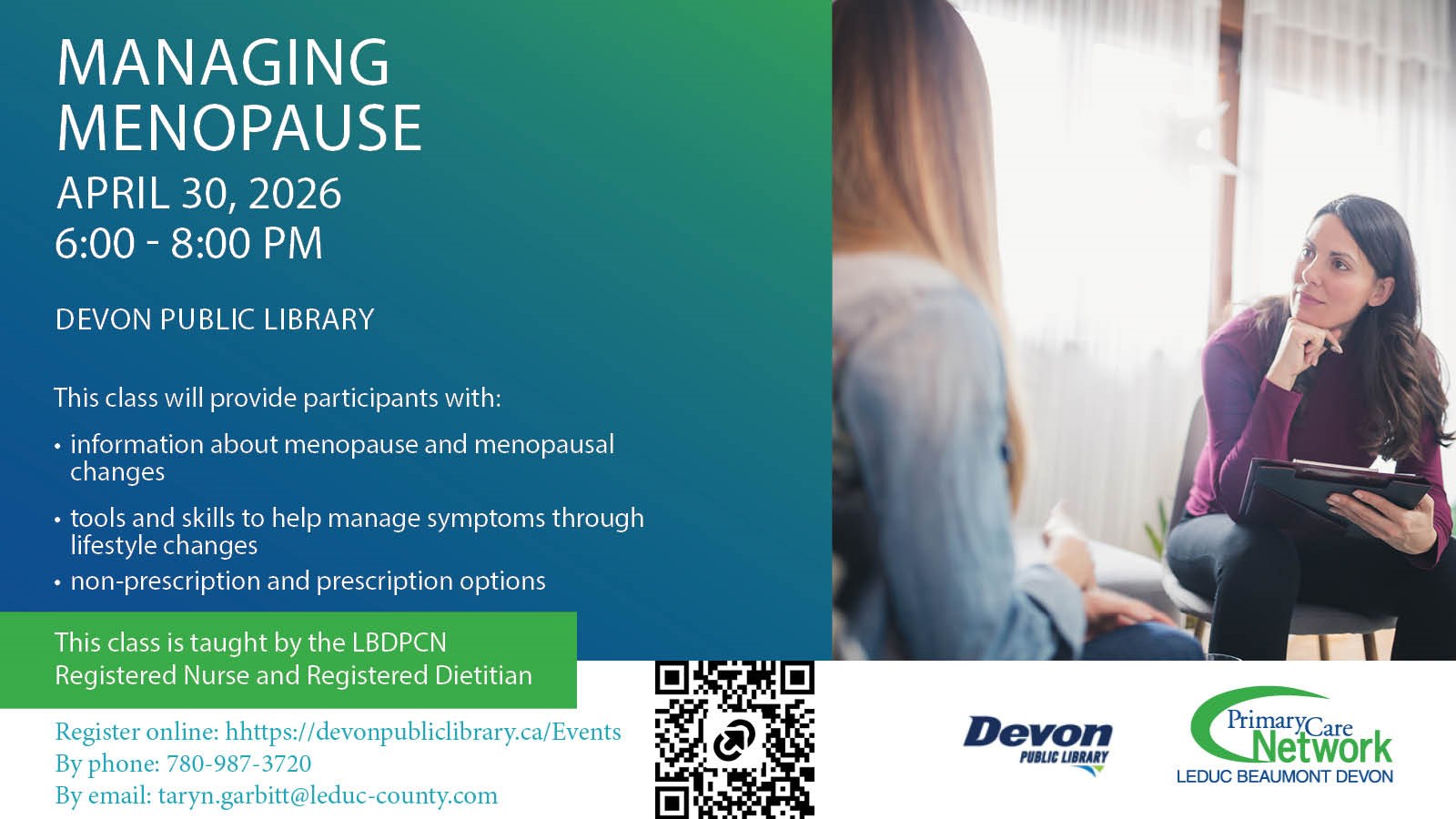 Managing Menopause Thursday, April 30: 6-8pm Register today for this in-person class taught by the Leduc Beaumont Devon Primary Care Network Registered Nurse and Registered Dietitian. This class will provide participants with: • information about menopause and menopausal changes • tools and skills to help manage symptoms through lifestyle changes • non-prescription and prescription options |