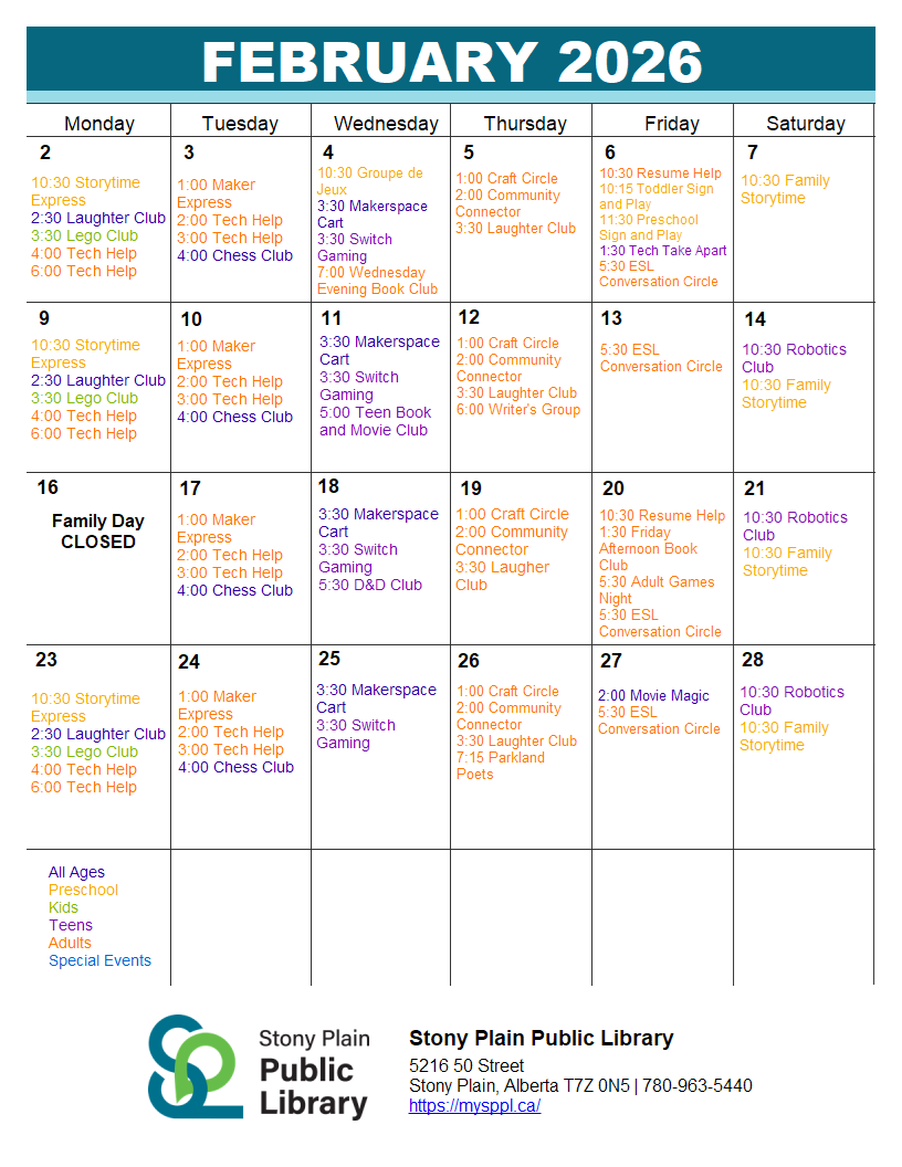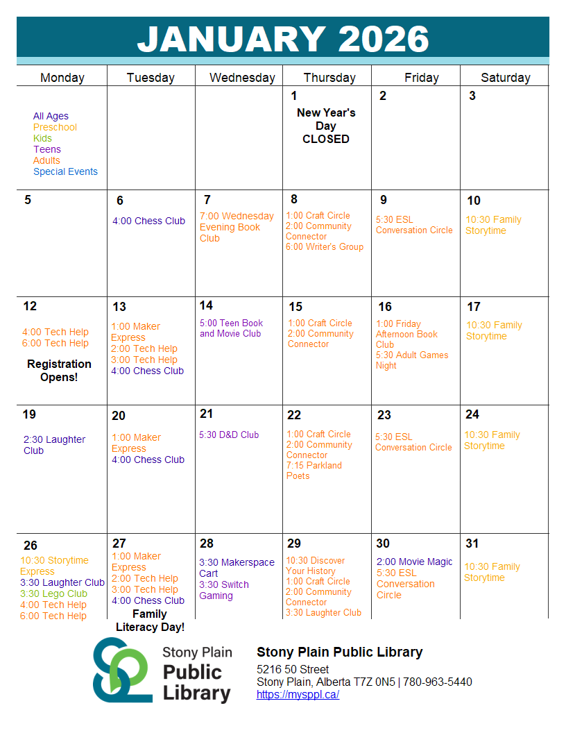 Stony Plain Public Library 5216 50 Street Stony Plain, Alberta T7Z 0N5 780-963-5440https://mysppl.ca/ |