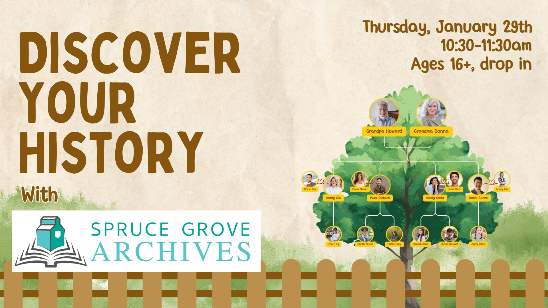 Discover Your History Thursday, Jan. 29, 10:30-11:30am Join the Spruce Grove Archives for a fascinating community workshop on what archives are, why they matter, and how they can help you preserve your own family history. Learn about the rich collections housed right inside the Spruce Grove Library—from photographs and maps to oral histories and local records—and explore how you can contribute to preserving your story. Ages 16+ Drop in