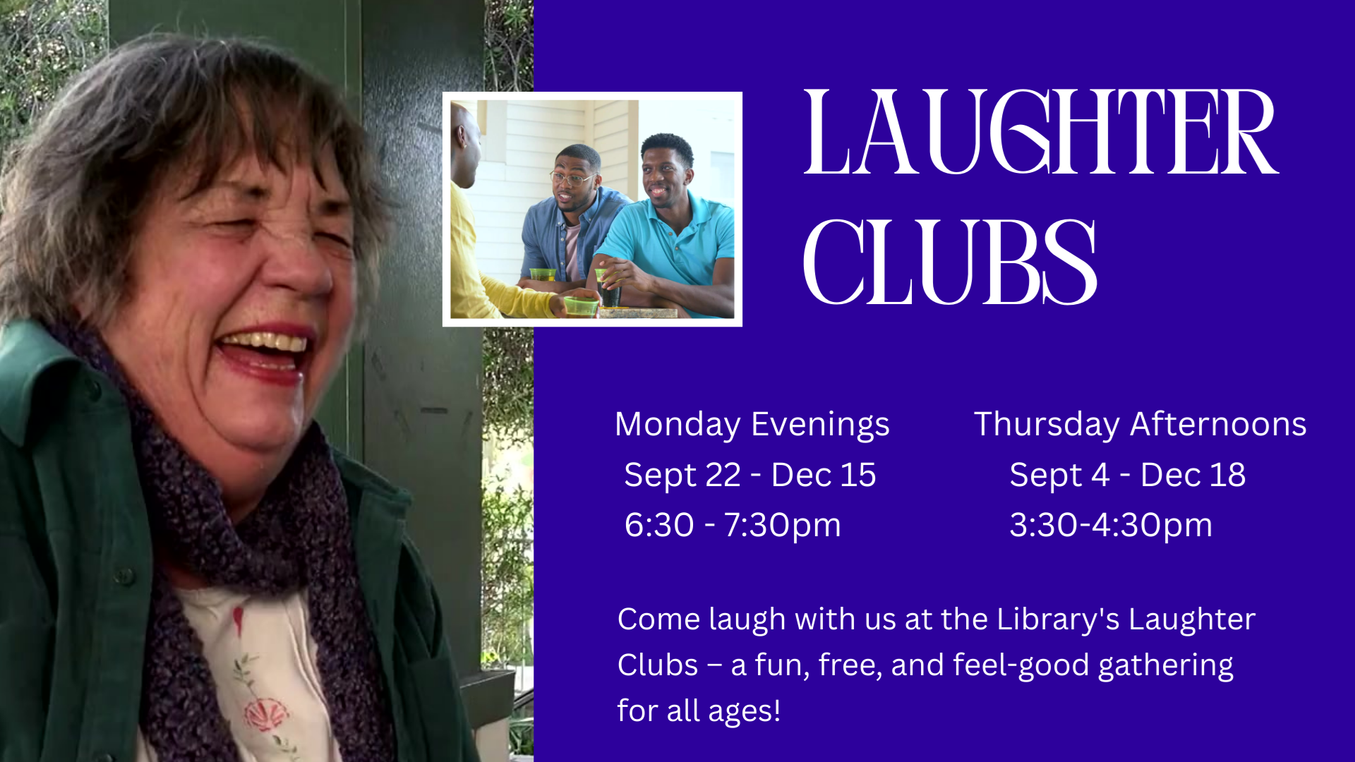 Laughter Clubs Thursdays, 3:30-4:30pmJoin the Laughter Club – Where Joy Meets Community! Need a break from the stress of daily life? Want to boost your mood, make new friends, and share some smiles? Come laugh with us at the Library's Laughter Club – a fun, free, and feel-good gathering for all ages! All ages, drop in
