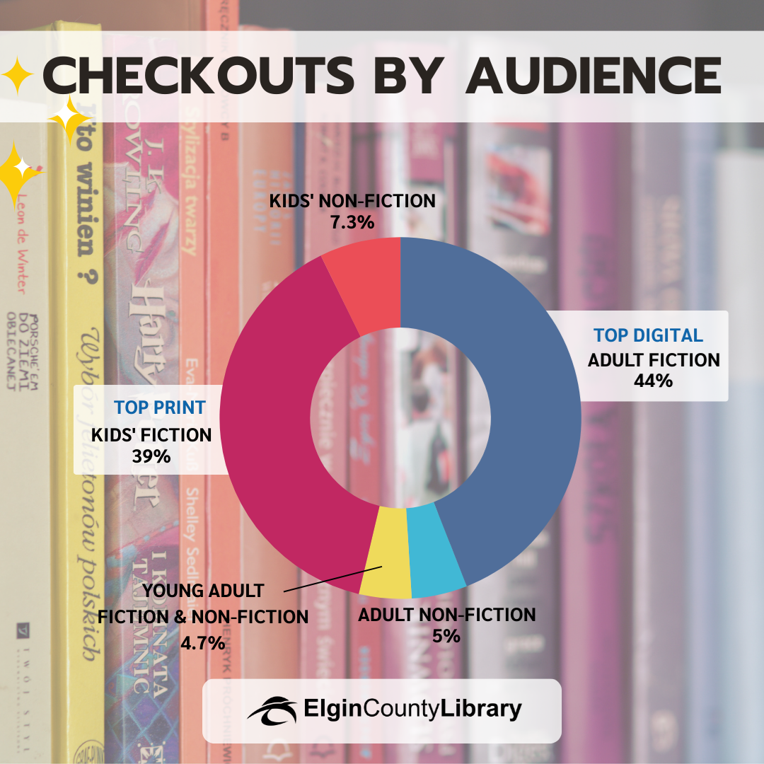 Checkouts by Audience Across All Formats: 44% Adult Fiction (Most popular in Digital) 39% Kids' Fiction 7.3% Kids' Non-fiction 5% Adult Non-fiction 4.7% Young Adult Fiction & Non-fiction combined