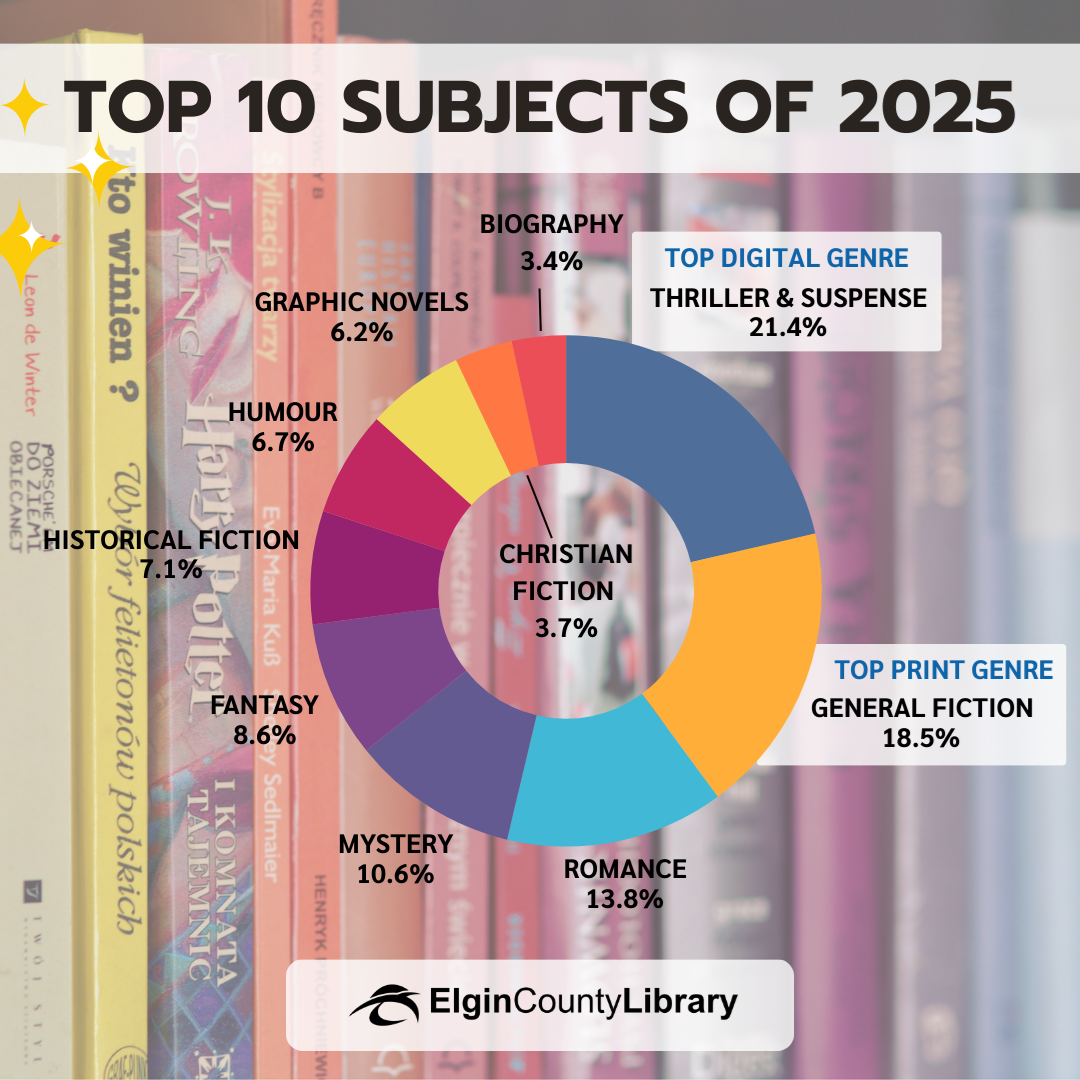 (Most popular in Digital) 18.5% General Fiction 13.8% Romance 10.6% Mystery 8.6% Fantasy 7.1% Historical Fiction 6.7% Humour (Fiction) 6.2% Graphic Novels 3.7% Christian Fiction 3.4% Biography