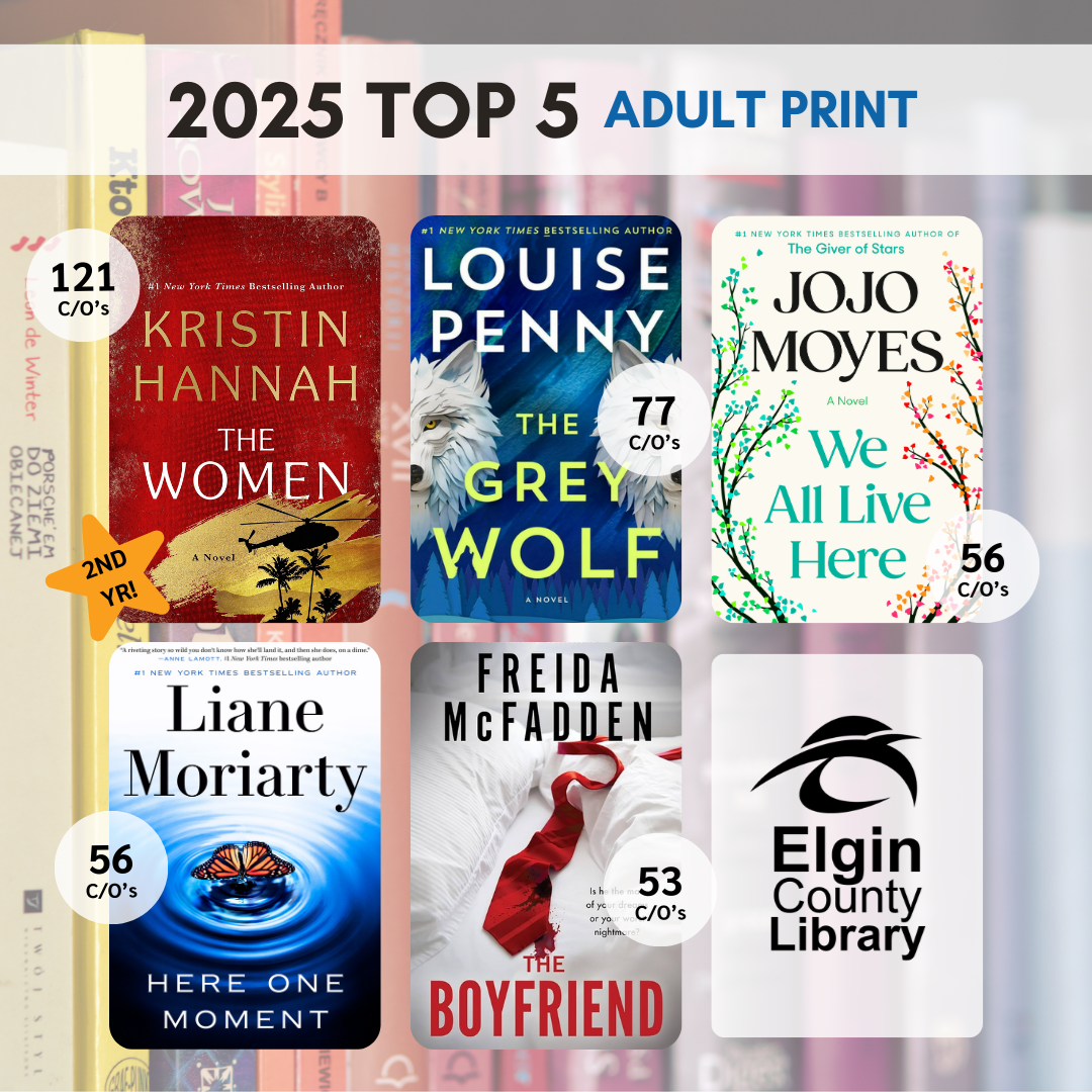Top 5: Adult Print Titles For the second year in a row, The Women by Kristin Hannah has captured your hearts in print, this year with 121 checkouts.