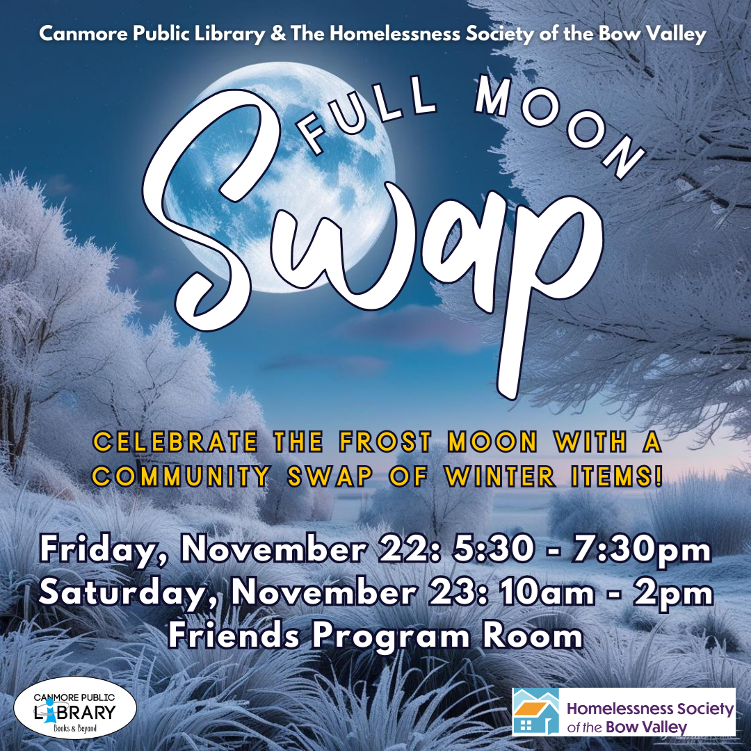 The Canmore Library and the Homelessness Society of the Bow Valley have come together to celebrate the Frost Moon with a community swap of winter items! The November full moon is also known as the Frost Moon due to the tendency for frosty weather this time of year. In the spirit of the Frost Moon, let's get cold-weather ready at our November Full Moon Swap! A community swap of all things wintry could include winter gear like jackets, sweaters, snow pants, gloves, mittens, hats, scarves, wool socks, and boots. Perhaps you have snow sport gear you no longer need like skates, skis, sleds etc. Other winter items could include mugs for hot cocoa, car scrapers, shovels, heaters, and more! The swap will take place in the Friends of the Library Program Room at the CPL. Full Moon Swap - November Frost Moon Friday, November 22: 5:30 - 7:30pm Saturday, November 23: 10:00am - 2:00pm Friends Program Room WE WANT YOUR FEEDBACK! We are dedicated to enhancing our swap events and would love to hear your thoughts. Whether you've attended our monthly Full Moon Swaps or the bi-annual Clothing Swap-O-Ramas, or if you haven't yet participated, your feedback is vital. To help us shape future swaps, please complete the survey found here. Thank you to the Homelessness Society of the Bow Valley for their continued support in running the swaps!