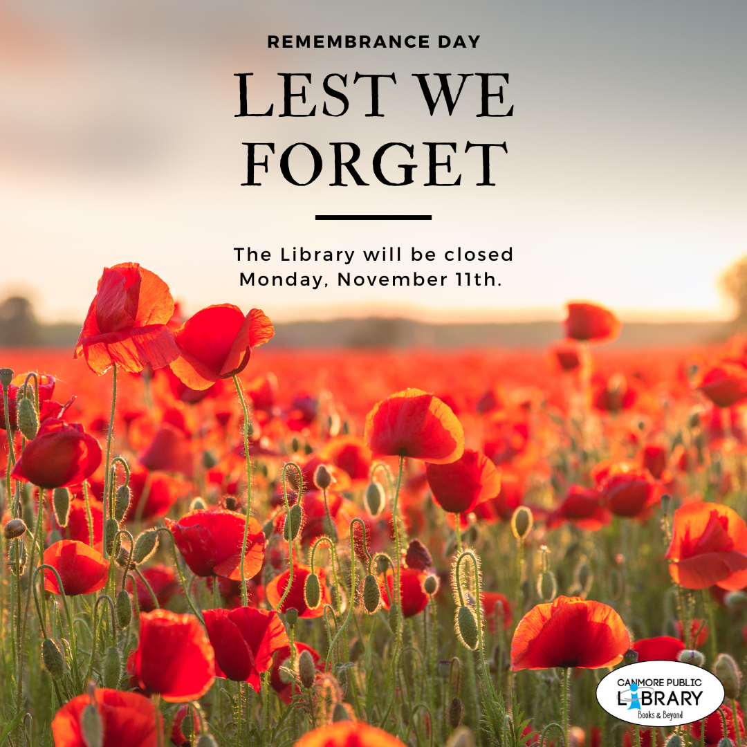 The Canmore Public Library will be closed on Monday, November 11th in honour of Remembrance Day. We will resume our regular services on Tuesday, November 12th at 10:00am. We would like to take this time to express our gratitude to all those who have served, and continue to serve, Canada in times of war and peace. We honour those who have fallen in service of our country. We remember. Lest we forget. "When you go home, tell them of us and say, For your tomorrows these gave their today."