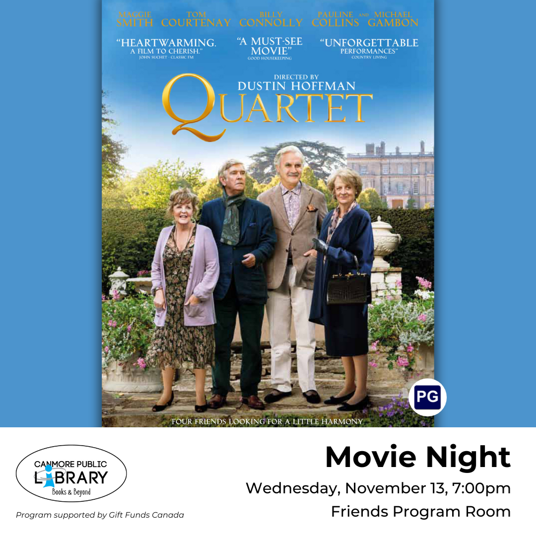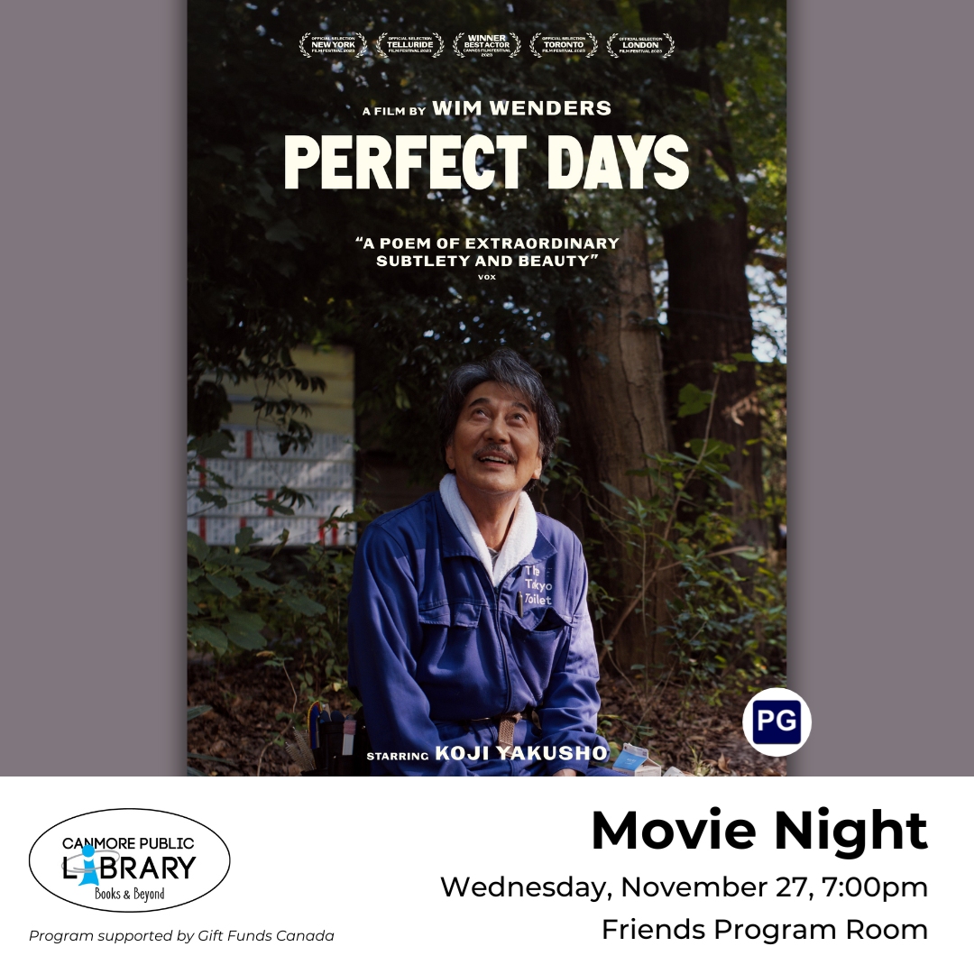 Every other Wednesday evening the Canmore Library shows a movie in the Friends of the Library Program Room starting at 7:00pm. Selections vary between classics and new releases. Admission is FREE, donations accepted. Bring a pillow, a bowl of popcorn, or even a friend! Make yourself at home and enjoy the cinematic experience. November 13: Quartet At a home for retired musicians, the annual concert to celebrate Composer Giuseppe Verdi's birthday is disrupted by the arrival of Jean (Dame Maggie Smith), an eternal diva and the former wife of one of the residents. Directed by Dustin Hoffman. Rated PG. Runtime: 1h 38m. Click here to view the IMDb listing. November 27: Perfect Days Hirayama works as a toilet cleaner in Tokyo. He seems content with his simple life. He follows a structured everyday life and dedicates his free time to his passion for music and books. Hirayama also has a fondness for trees and photographs them. More of his past is gradually revealed through a series of unexpected encounters. Directed by Wim Wenders. Rated PG. Runtime: 2h 4m. Click here to view the IMDb listing