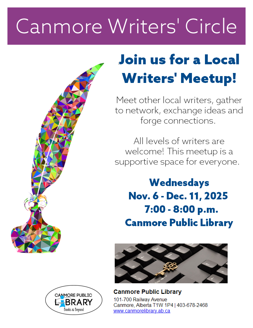 Are you a writer looking to connect with others in your community? Whether you’re a seasoned novelist, a budding poet, or simply writing-curious, we invite you to join us for an inspiring gathering of local writers! Canmore Writers' Circle will take place on Wednesday evenings at 7:00pm from November 6th - December 11th. Visit our website for all the details. No registration necessary.