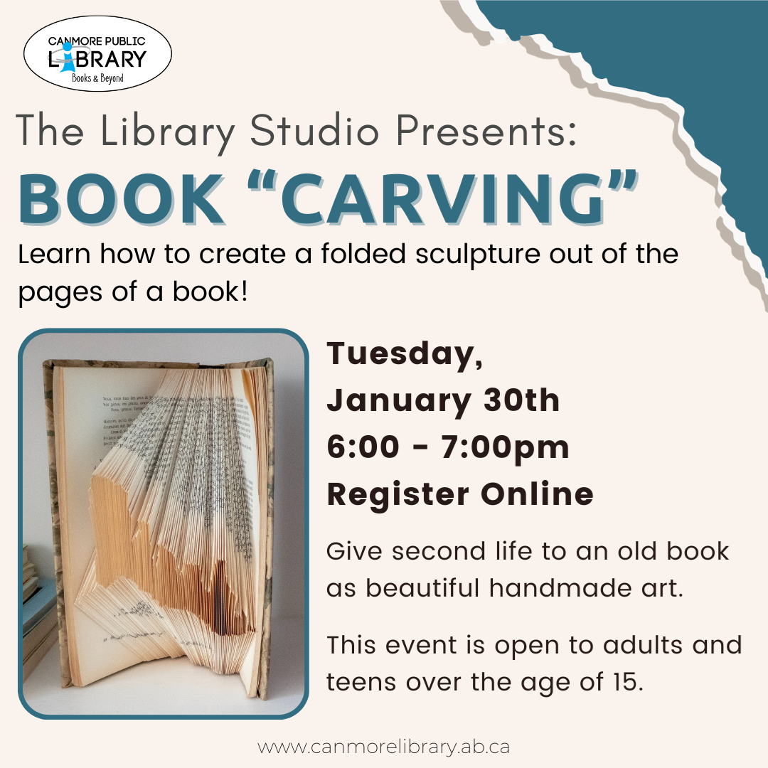 Books are ephemeral materials, meaning that they are meant to be used and enjoyed for a short time - in creating something new out of an old and unused book, it gives it a second life as beautiful handmade art. Join us at The Library Studio Presents: Book "Carving", in which you will learn how to create a folded sculpture out of the pages of a book! This guided event will provide you with a (previously discarded) book that you will use to create a folded sculpture. There are a variety of templates that you can choose from, and take home for a chance to create your own book carvings at home. This event is open to adults and teens over the age of 15. The Library Studio Presents: Book "Carving" will take place on Tuesday, January 30th from 6:00 - 7:00pm in the Friends Program Room.