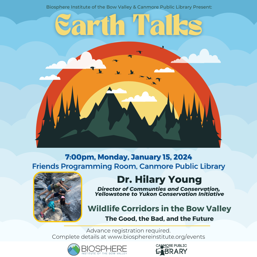 Join Dr. Hilary Young, Director of Communities and Conservation, Yellowstone to Yukon Conservation Initiative, at the Canmore Public Library for their presentation "Wildlife Corridors in the Bow Valley: The Good, the Bad, and the Future." Can't make it in person? Watch live over Zoom the day of the event! Find the link to join on our website. Attendees will learn: - What are wildlife corridors, why are they important, and why do I hear so much about them in the Bow Valley?