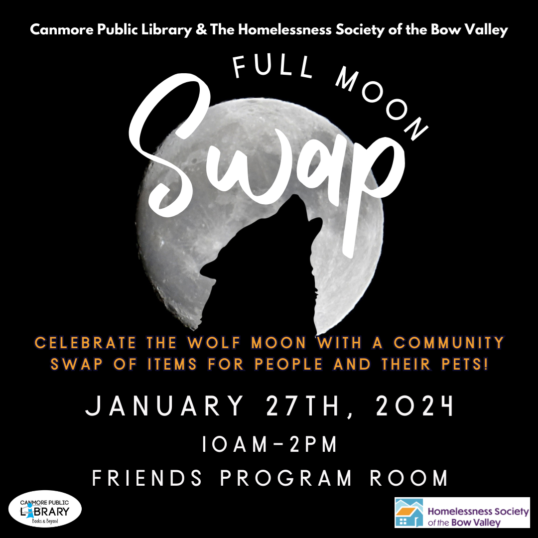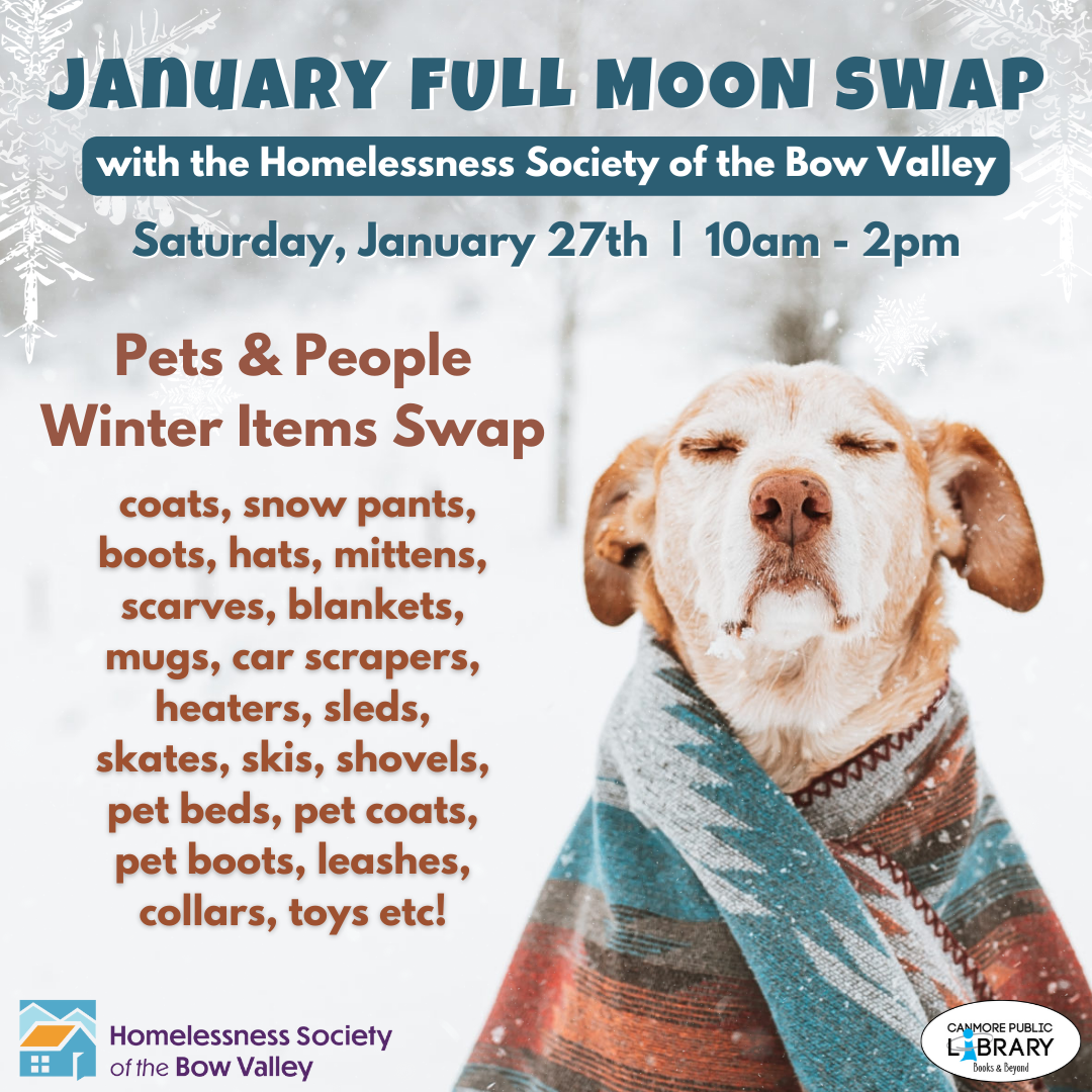 We are thrilled to be teaming up with the Homelessness Society of the Bow Valley again for this month's swap! The January full moon is also known as the Wolf Moon. With that in mind, our January Full Moon Swap is a community swap for people and their pets. (You do not need to have a pet to attend the swap!) For the people... Let's keep getting winter ready with another community swap of winter items! This could include winter gear like jackets, snow pants, gloves, mittens, hats, scarves, and boots. Perhaps you have snow sport gear your no longer need like skates, sleds, skis etc. Other winter items could include mugs for hot cocoa, car scrapers, shovels, heaters, hand warmers and more! For the pets... Is your cat tired of all their toys? Has your dog outgrown their collar, coat, or crate? Perhaps you have unused pet beds and blankets, pet boots, food bowls, or leashes lying around. Bring them to the Wolf Moon Swap! (Alternatively, if you need those items - come to the Wolf Moon Swap!) The swap will take place in the Friends of the Library Program Room at the CPL on Saturday, January 27th from 10am - 2pm. Bring any items you have to donate to Library the day of the swap!