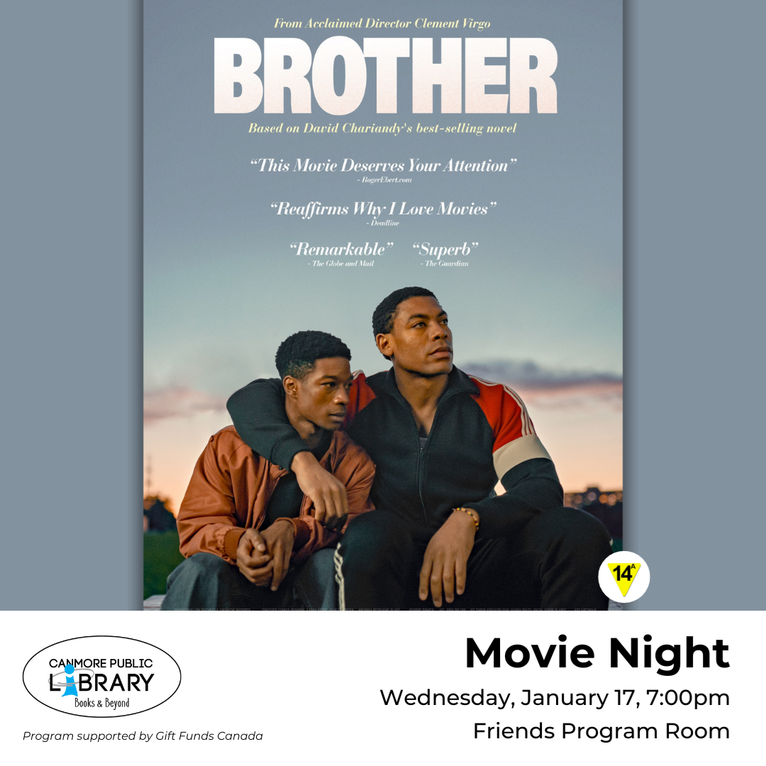 Every other Wednesday evening the Canmore Library shows a movie in the Friends of the Library Program Room starting at 7:00pm. Selections vary between classics and new releases. Admission is FREE, donations accepted. We'll supply the popcorn, so just bring a pillow and your friends! Make yourself at home and enjoy the cinematic experience. We are busy planning the 2024 Movie Night schedule, and want to hear from YOU! If you have any movie suggestions, please email them to info@canmorelibrary.ab.ca January movies are as follows: January 17 - Brother Sons of Caribbean immigrants, Francis and Michael face questions of masculinity, identity and family amid the pulsing beat of Toronto's early hip-hop scene. Directed by Clement Virgo. Rated 14A. Runtime: 1h 59m. Click here to view the IMDb listing. January 31 - You Hurt My Feelings A novelist's longstanding marriage is suddenly upended when she overhears her husband giving his honest reaction to her latest book. Directed by Nicole Holofcener. Rated PG. Runtime: 1h 33m. Click here for the IMDb listing.
