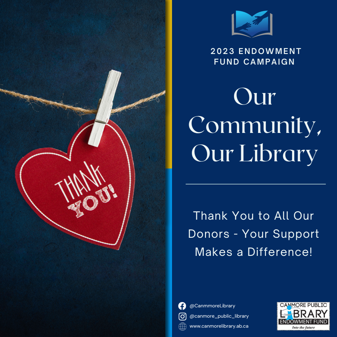 We would like to send a heartfelt thank you to everyone who supported the Canmore Library Endowment Fund during our 2023 "Our Community, Our Library" campaign. Thanks to the generosity of all our donors, the campaign was a huge success! We hope you know how much your support makes a difference in our library's future. We are still waiting for the definitive results of the campaign - stay tuned for the final announcement in our February newsletter! Library Director Michelle Preston and Banff Canmore Foundation Executive Director Laurie Edward had a chance to speak with Rob Murray from 106.5 Mountain FM about the Endowment Fund Campaign. If you missed it on air, be sure to check it out online!