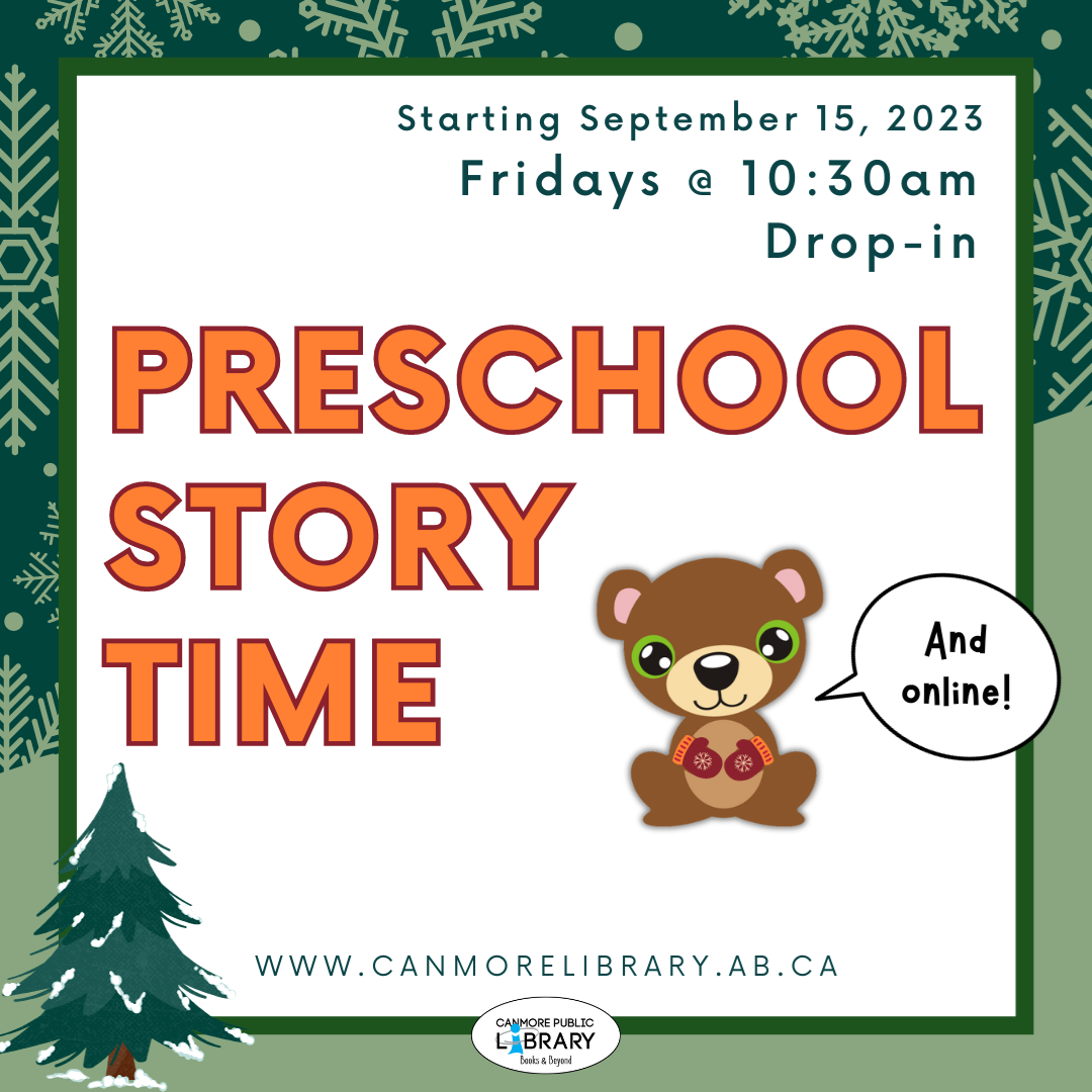 Fridays January 19 - March 22 10:30 - 11:00am A mix of picture books, silly rhymes, and action-songs, this storytime is perfect for preschoolers aged 3-5 who are ready for longer stories. The program is designed to help build their attention span and foster a continual love of stories. Preschool Storytime will be a hybrid program. You can still join through Zoom, at the same day and time, for any who wish to join remotely.