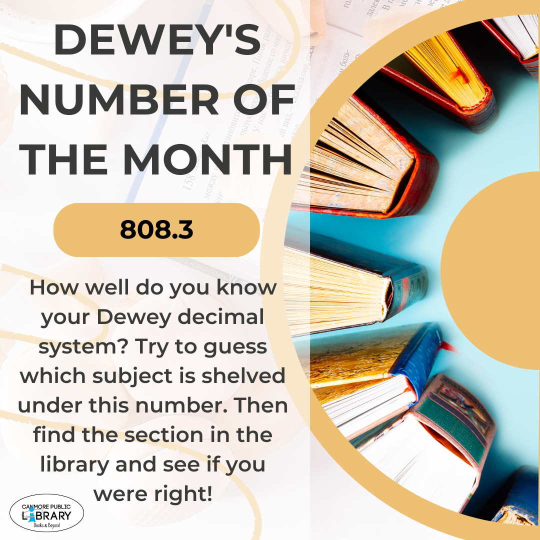 Dewey's Number of the Month for November is: 808.3. Can you guess which subject is shelved under this number? Find the section in the library to see if you were right! Each month we'll have a new number to challenge your Dewey decimal knowledge!