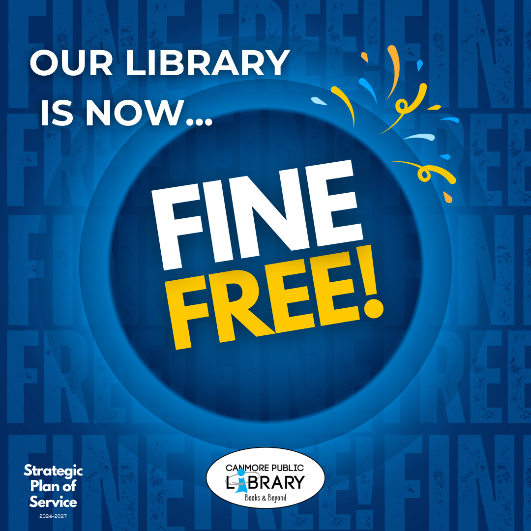 The Canmore Public Library is now overdue FINE FREE! One of our top priorities over the next four years includes removing financial barriers that impact library access and use. Eliminating fines on overdue materials removes one of those barriers and helps us to provide equitable access for all. Any overdue fines currently on an account will be waived. Lost and damaged fines are still in effect.