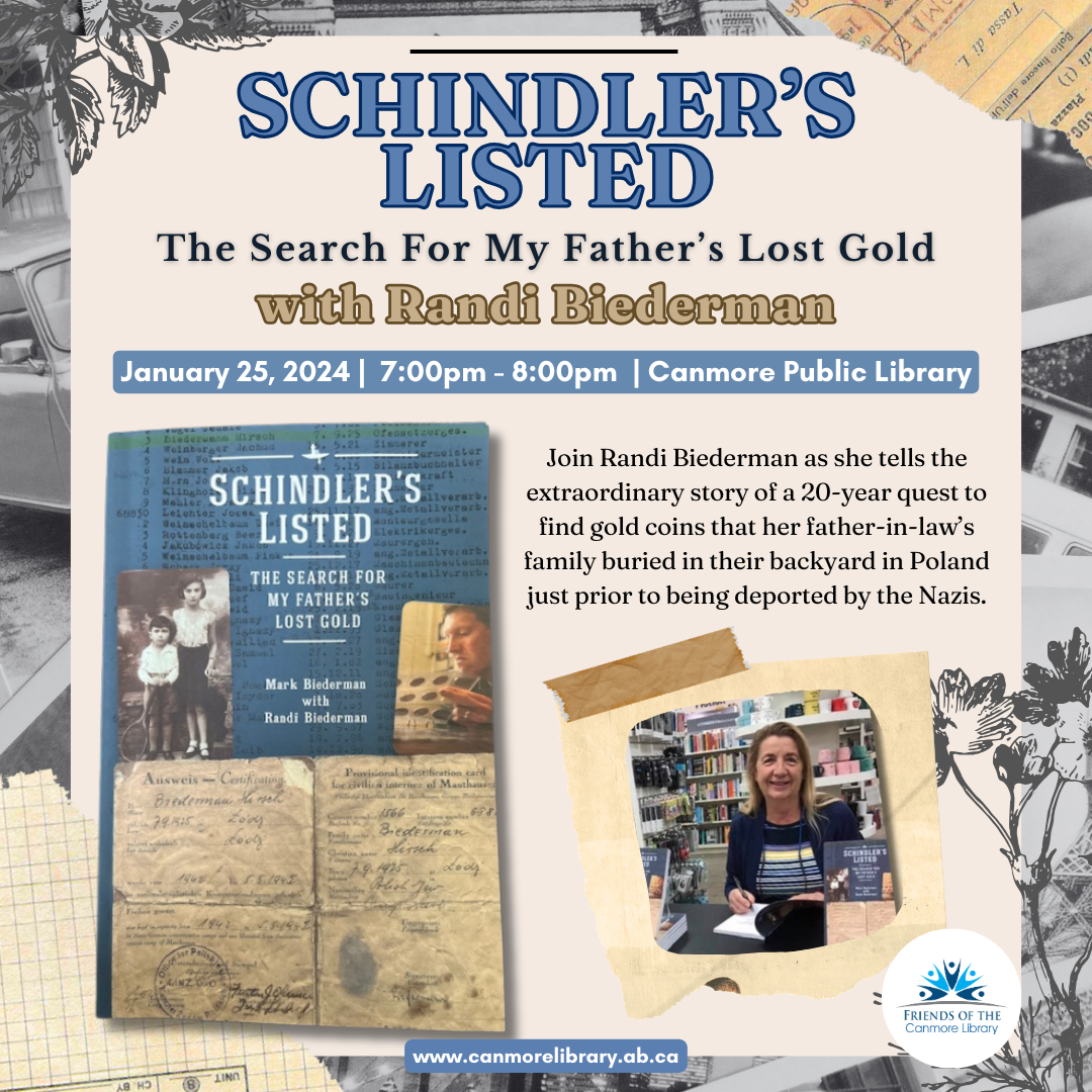 The Friends Speakers’ Series presents Randi Biederman speaking about her book Schindler's Listed: The Search For My Father's Lost Gold on Thursday, January 25th at 7:00pm in the Friends Program Room. Randi Biederman is the co-author of this non-fiction book about the life of her father-in-law, who was a Schindler's List Survivor. Biederman will be presenting an overview of the book and discussing her late husband’s journey to write the book. It is, at its core, a Holocaust story - but it is much more than that. It is a story of tenacity, survival, of serendipity and a treasure hunt. The book resulted from a 20-year quest to solve the riddle of missing coins and missing family members. Biederman has been invited across North America to speak about the book "Schindler's Listed" and we are thrilled to host her at the Canmore Library! Please join us for what is sure to be a very interesting presentation. Admission is free with donations graciously accepted.