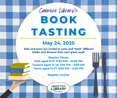 Welcome to the Canmore Library Book Tasting Café! Looking for a fun way to discover your next great read? Join us at the Canmore Public Library for a Book Tasting—a creative, café-style event where kids and teens can sample a variety of books, explore new genres and authors, and share their thoughts with fellow readers! With three age-specific sessions, there’s something for every young book lover. Snacks provided! Registration is required as spots are limited! Click on the session time below to register on our website. When: Saturday, May 24, 2025 Where: Friends Program Room – Canmore Public Library