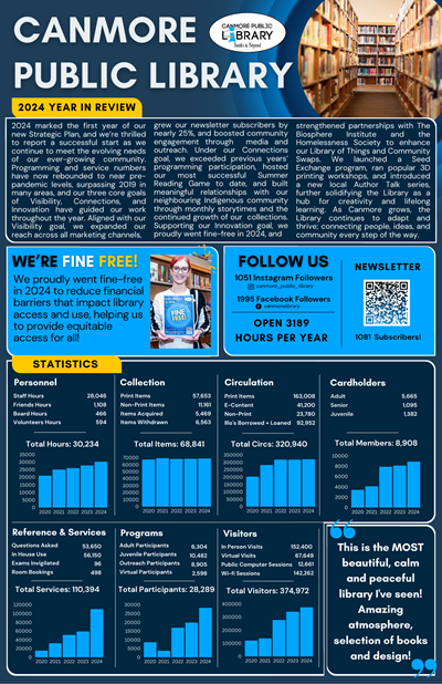 2024 marked the first year of our new Strategic Plan, and we’re thrilled to report a successful start as we continue to meet the evolving needs of our ever-growing community. Programming and service numbers have now rebounded to near pre-pandemic levels, surpassing 2019 in many areas, and our three core goals of Visibility, Connections, and Innovation have guided our work throughout the year. Aligned with our Visibility goal, we expanded our reach across all marketing channels, grew our newsletter subscribers by nearly 25%, and boosted community engagement through media and outreach. Under our Connections goal, we exceeded previous years’ programming participation, hosted our most successful Summer Reading Game to date, and built meaningful relationships with our neighbouring Indigenous community through monthly storytimes and the continued growth of our collections. Supporting our Innovation goal, we proudly went fine-free in 2024, and strengthened partnerships with The Biosphere Institute and the Homelessness Society to enhance our Library of Things and Community Swaps. We launched a Seed Exchange program, ran popular 3D printing workshops, and introduced a new local Author Talk series, further solidifying the Library as a hub for creativity and lifelong learning. As Canmore grows, the Library continues to adapt and thrive; connecting people, ideas, and community every step of the way.
