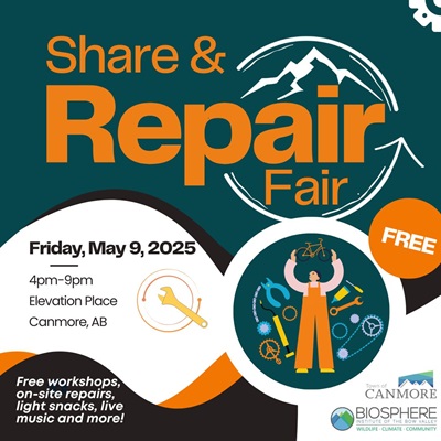Join the Town of Canmore and the Biosphere Institute of the Bow Valley on Friday, May 9, 2025, from 4–9 PM at Elevation Place for an evening of hands-on fun, learning, and community connection at the Share and Repair Fair!