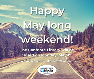 Please note that we will be closed on Monday, May 19th for Victoria Day. We will resume regular operations on Tuesday, May 20th at 10:00am. Wishing you a safe and happy May long weekend! Please note that the Canmore Public Library will be closed on Monday, May 26th for staff professional development. There will be no staff on site on this day. The Library will resume regular services on Tuesday, May 27th at 10:00am.