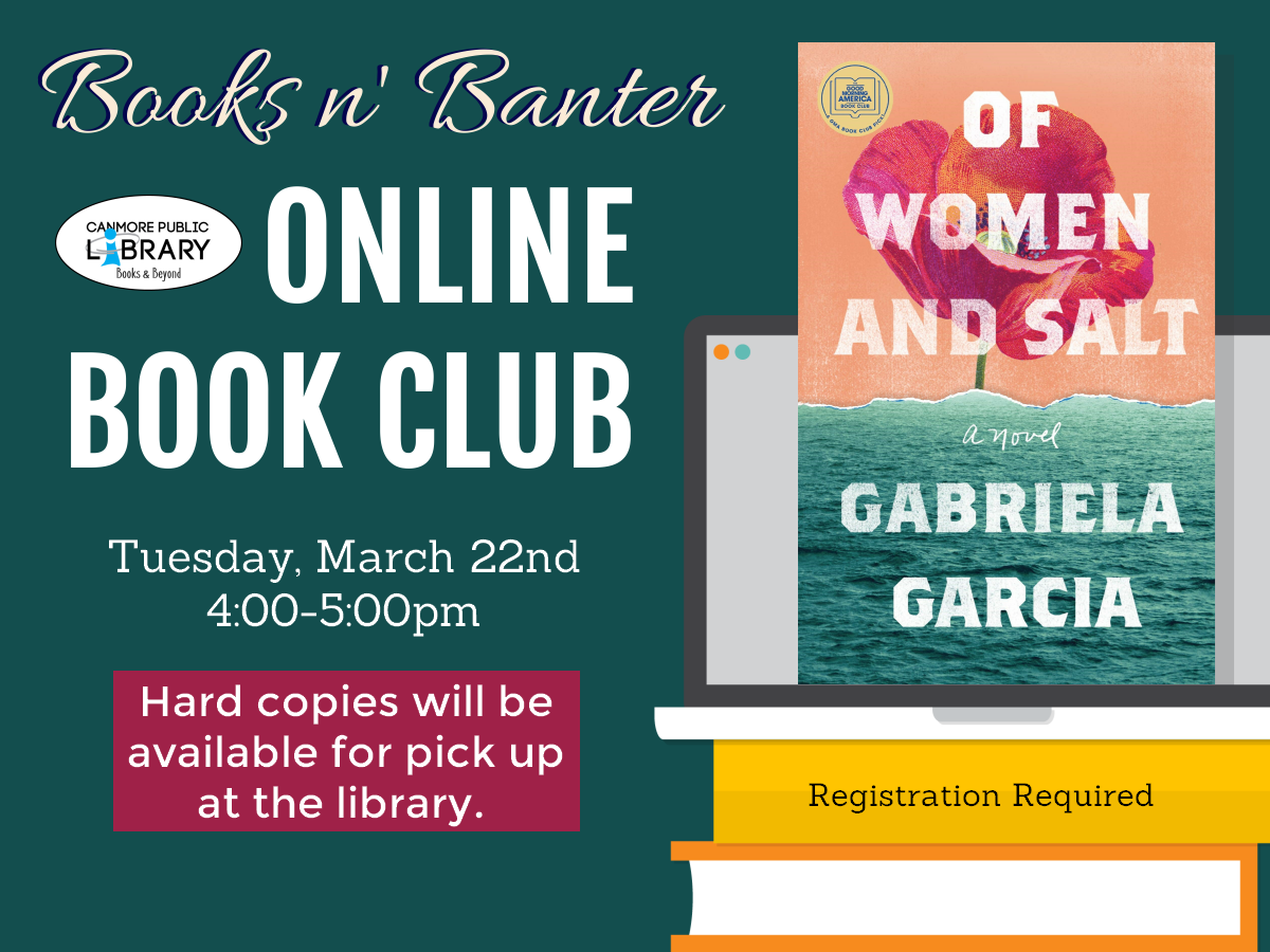 March's book is Of Women and Salt by Gabriela Garcia. Hard copies are available for pick up at the library for those who register.
