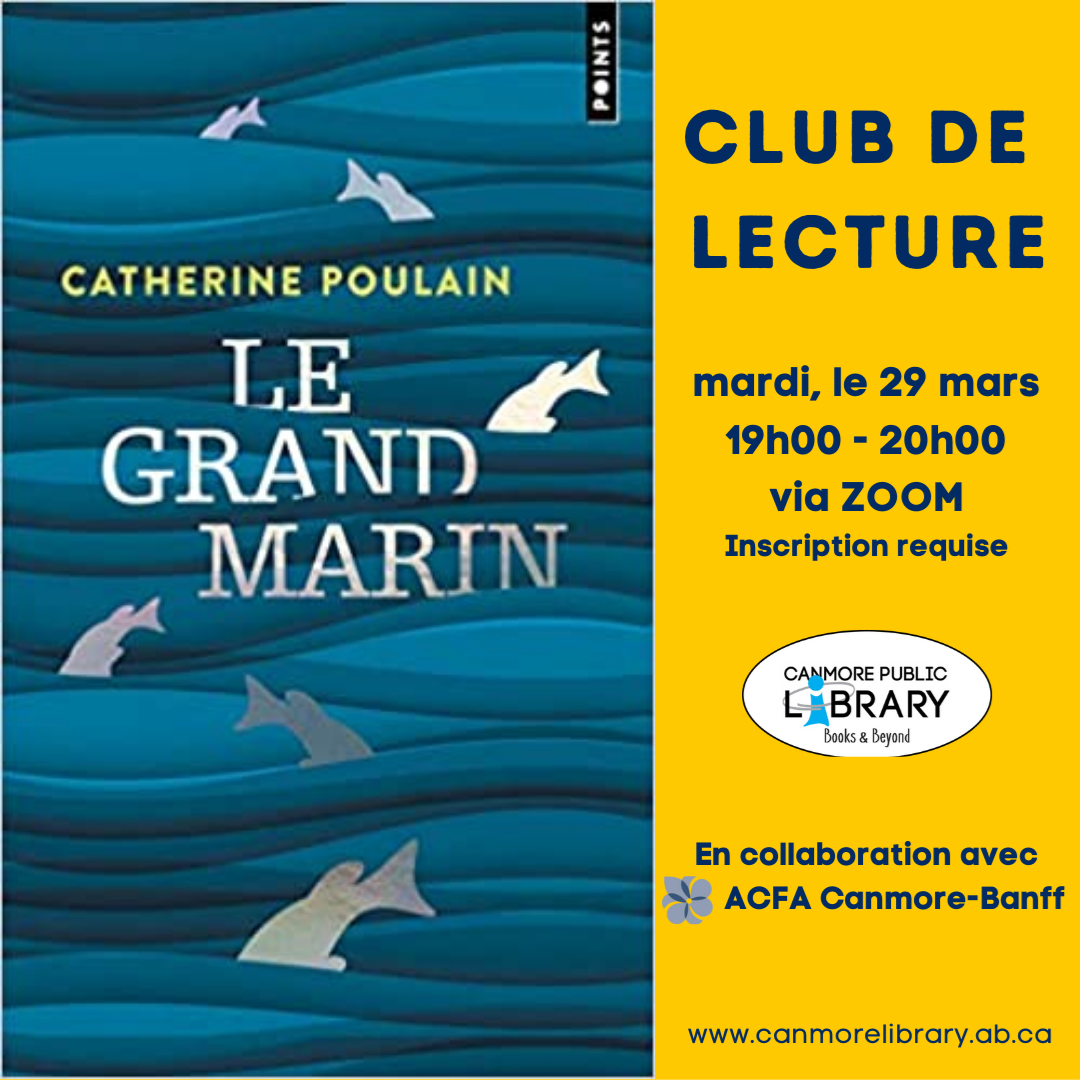 Rêvez-vous d'aller en voyage?  Vous n'avez plus à chercher! Le club de lecture est excité de lire 'Le Grand Marin' de Catherine Poulain.  Notre prochaine rencontre est mardi, le 29 mars à 19h00 sur Zoom.