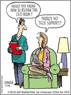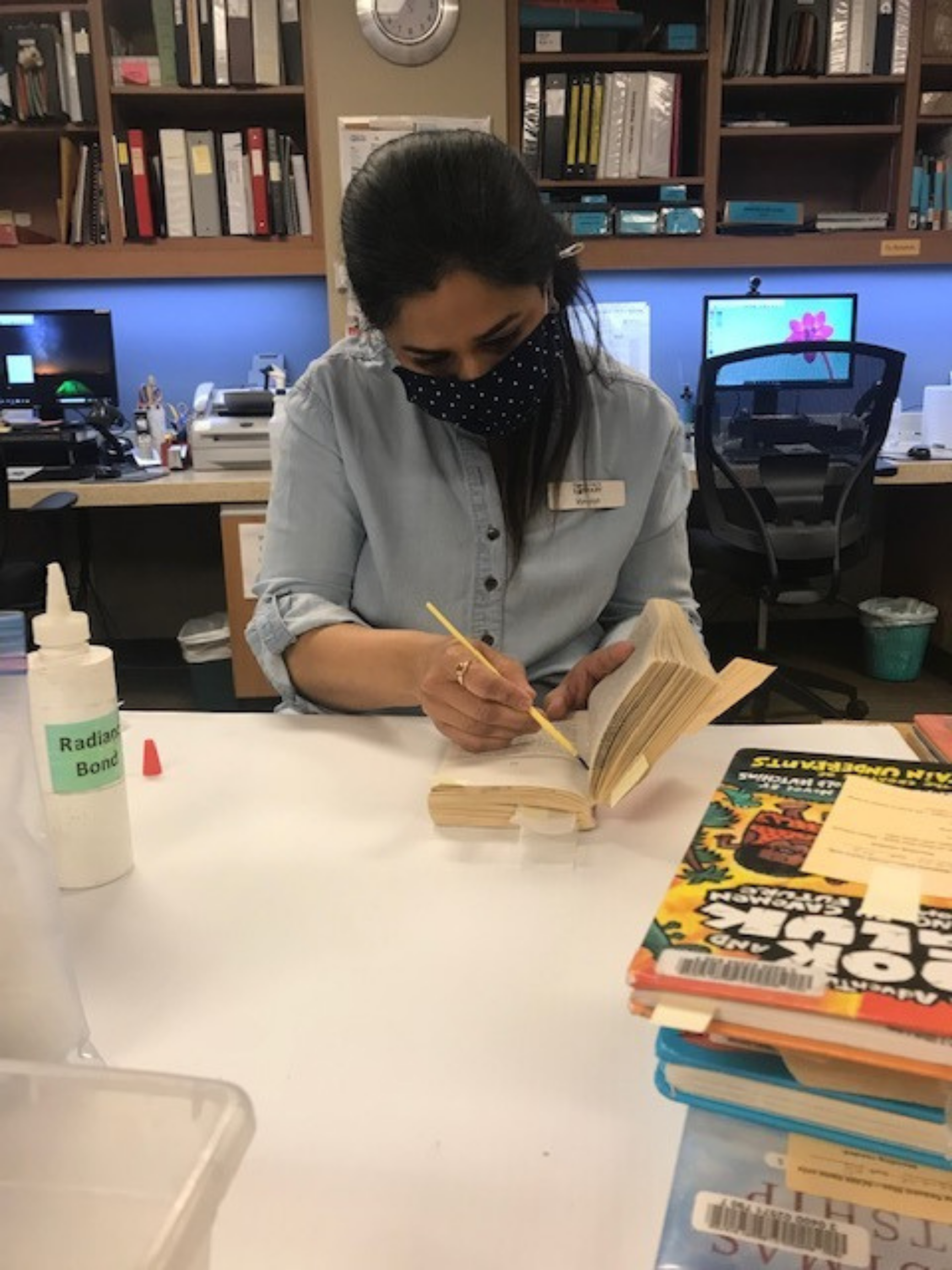 If you do accidentally damage a book by tearing a page or breaking it's spine - don't panic! Simply return the book to us as is, and please do not try to help us by taping it back together. Taping a book together actually makes our job more difficult. We have the special tools, skills and supplies needed to make most repairs almost invisible. If you do check out a book and notice repairs done, you can smile knowing a once sad book is happy again!