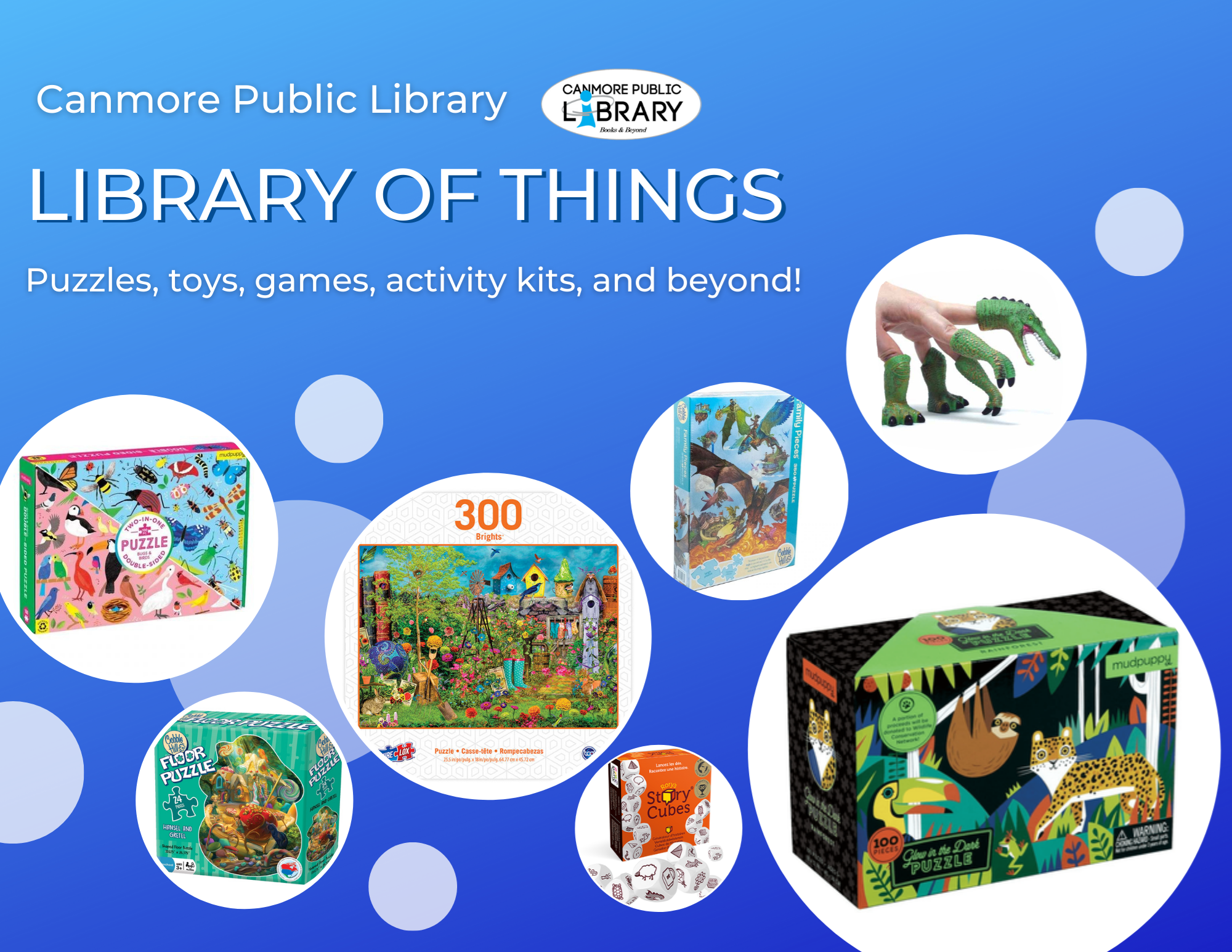 Local patrons with a Canmore Public Library card are able to borrow from our Library of Things. You can try out puzzles, toys, games, kits, and beyond! See our website for the complete list!