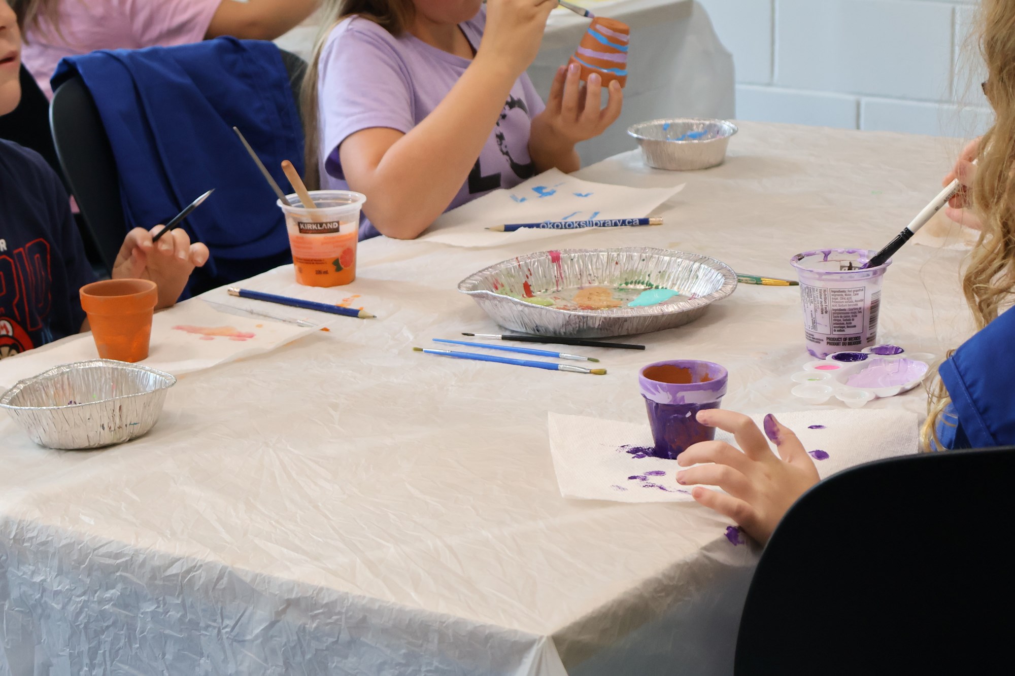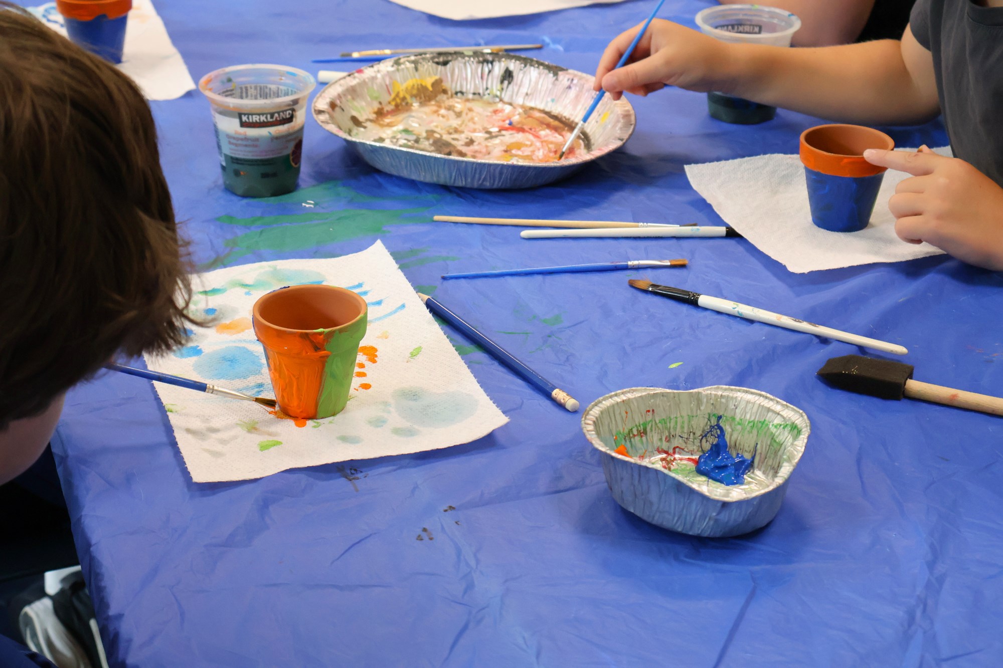 Little artists turned plain pots into colorful creations ready for planting, at Crafternoon.