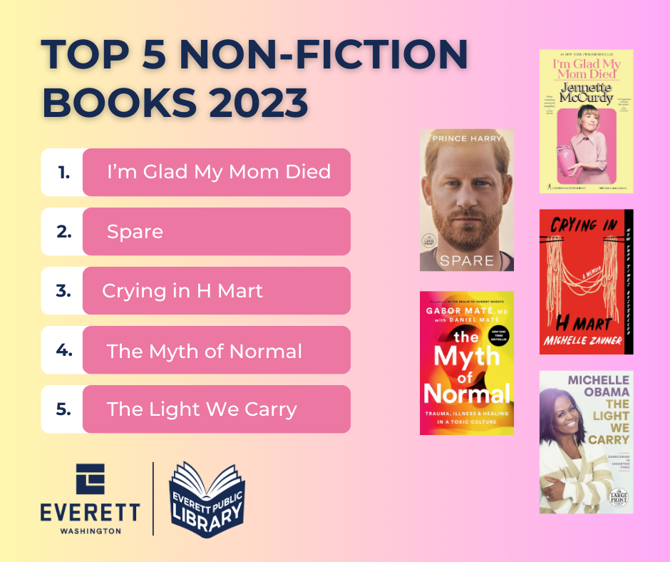 Everett Public Library users were voracious readers in 2023. Want to know what YOU checked out the most last year? Check out our lists of most popular check-outs!