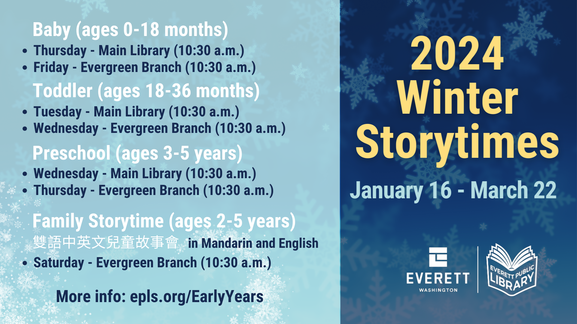 Winter storytime session begins Tuesday, January 16. Bring your kiddos to baby, toddler, or preschool storytimes Tuesday through Friday at both our branches. Plus, bilingual Mandarin storytime is back at the branch on Saturday mornings! All storytime sessions are at 10:30 a.m. For more info, visit epls.org/EarlyYears.