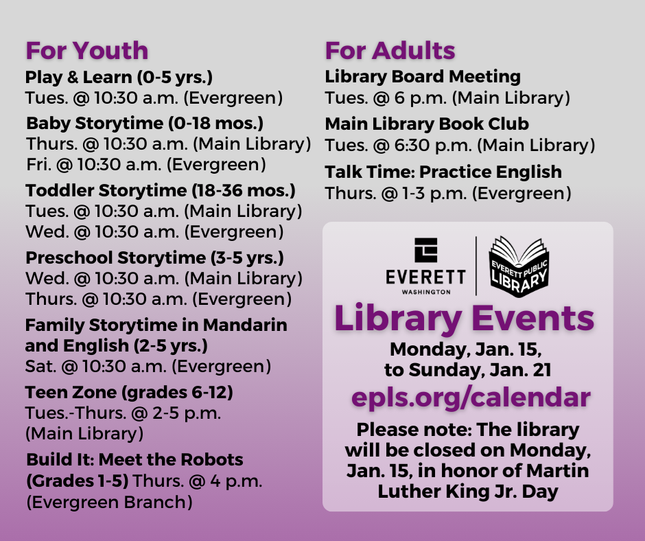 See all of our events for the upcoming week of Jan. 15 below. For more info, head to: epls.org/events. Please note: The library will be closed on Monday, Jan. 15, in honor of Martin Luther King Jr. Day.