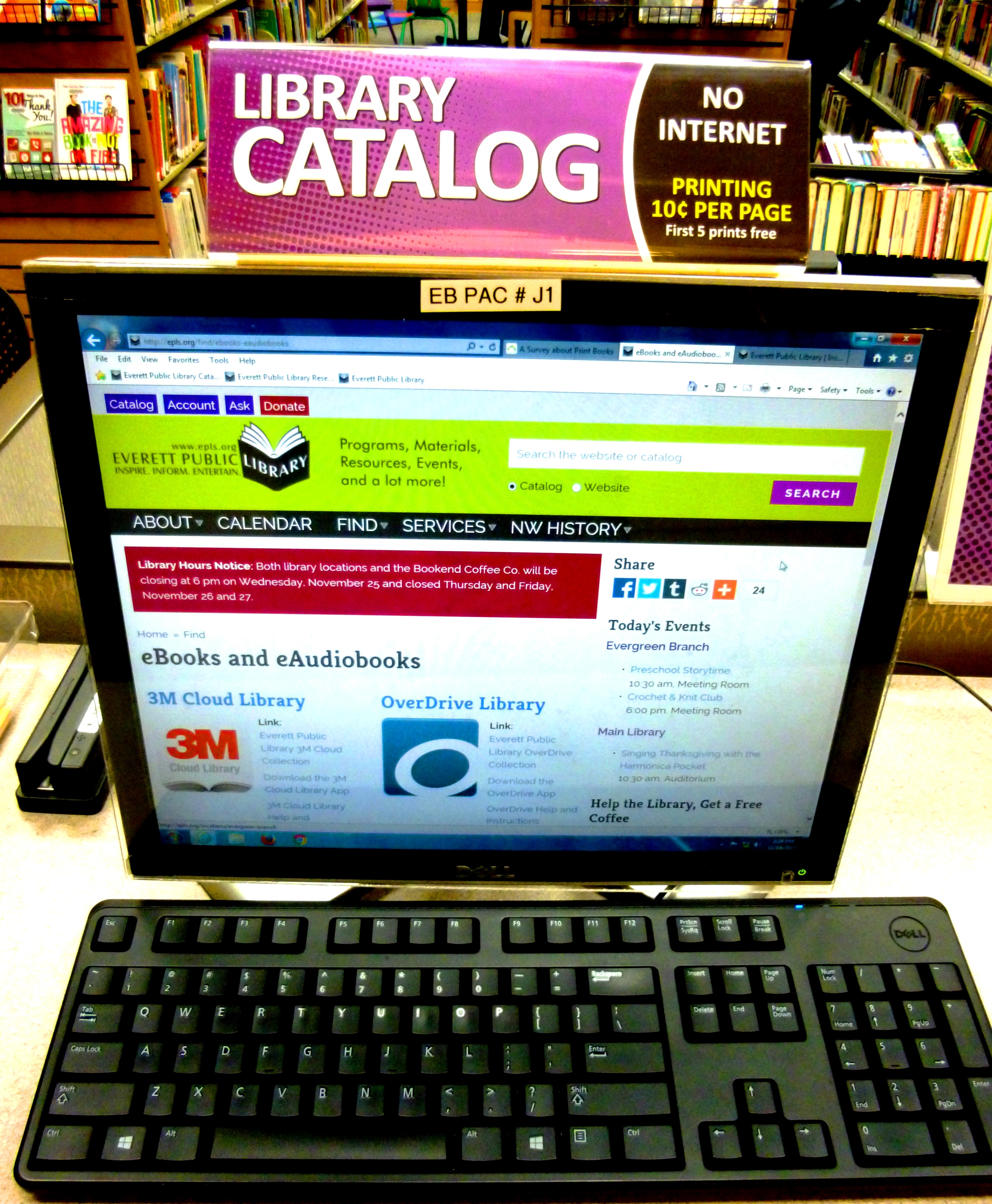 The Everett Public Library will be doing a monthly usability study of the library's catalog. Library staff will conduct usability interviews with the public on Monday, December 14. If you wish to participate, one test should take less than one hour of your time at our downtown location at 2702 Hoyt Ave. We are specifically looking for eBook users, but all are welcome to apply. Study participants will receive a $10 Bookend Coffee Company gift card and a small Everett Library branded item as thanks for their contribution to this study.