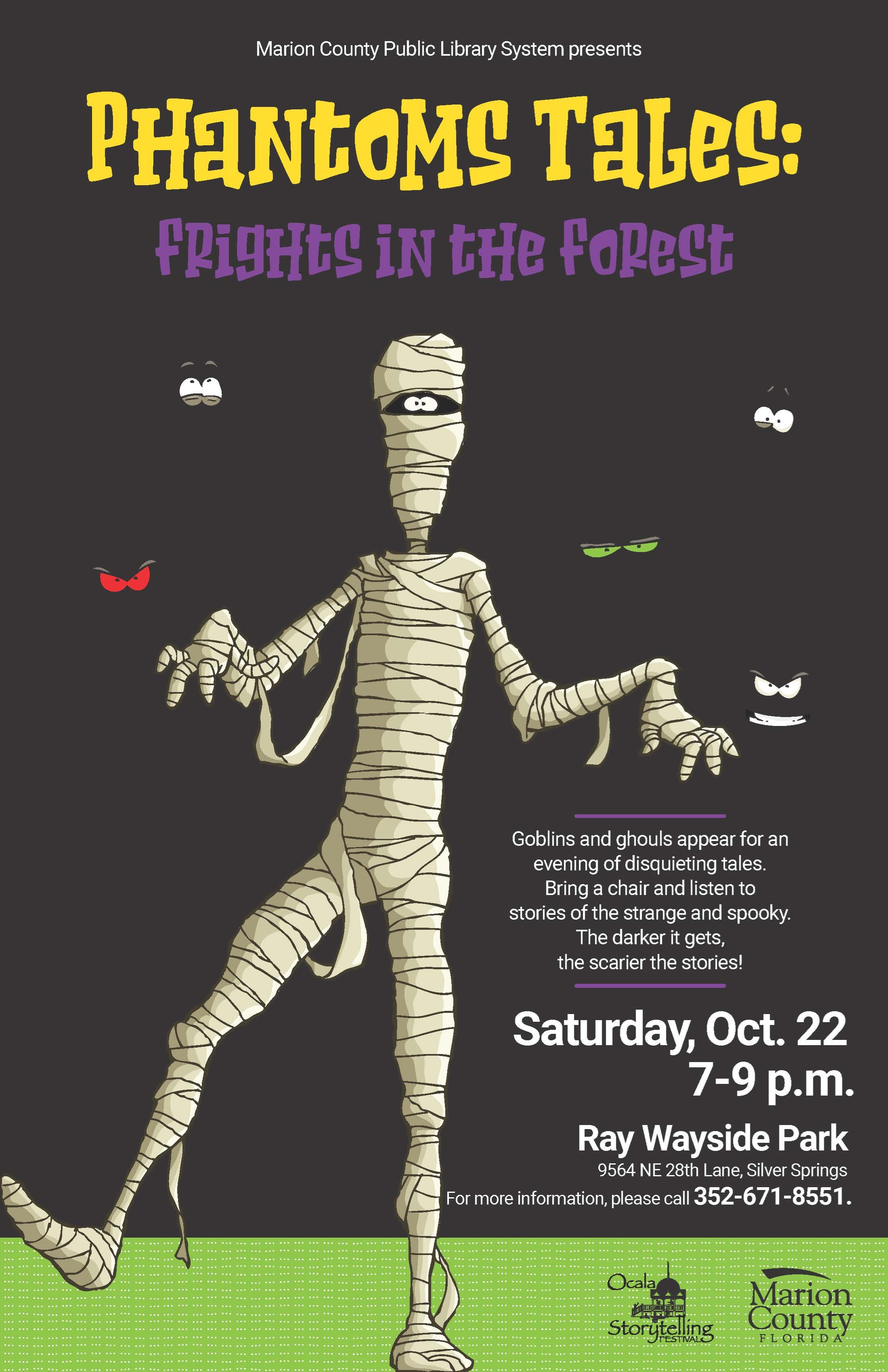 Saturday, Oct. 22, 7-9 p.m. Ray Wayside Park 9564 NE 28th Lane, Silver Springs Be bold! Goblins and ghouls appear for an evening of disquieting tales. Bring your chair and hear stories of the strange and spooky...if you dare. The darker it gets, the scarier the stories! Call 352-671-8551 for more information. Presented in partnership with MC Parks and Recreation and Ocala Storytelling Festival, Inc.