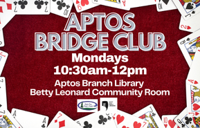 Join us Mondays at Aptos Branch Library for social Bridge! All skill levels welcome. Enjoy fun, friendship, and mental stimulation. Everyone is welcomed from beginners to social players. Make new friends and sharpen your mind. If you’re interested in playing Bridge, a table is waiting for you.