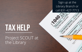 Project SCOUT provides free tax assistance to seniors, individuals with a disability, and low income residents of Santa Cruz County. Project SCOUT also assists with general tax questions. This free tax service will be available at the following libraries: Aptos, Felton, Capitola, and Downtown. Call 831-427-7713 or visit the branch to make an appointment.