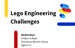 The Lego Challenge is a fun way for kids and tweens to learn about basic engineering, teamwork, and leadership by completing various Lego projects. All Lego challenges at this weekly program are self paced.