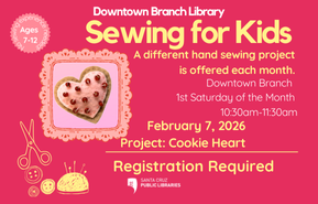 ¡Te invitamos a Sewing for Kids en Downtown! Un programa de costura diferente se ofrece cada mes. El proyecto de febrero es una galleta en forma de corazón. No se requiere experiencia de costura.