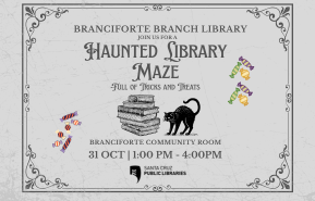 Laberinto embrujado en la biblioteca Disfruta de un divertido laberinto embrujado lleno de trucos y dulces. ¡El personal de Branciforte está encantado de compartir este nostálgico laberinto embrujado contigo y tus hijos! El laberinto incluye decoración espeluznante, elementos que brillan en la oscuridad, artículos colgantes y dulces en cada esquina.