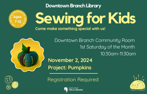 Come make something special with us! A different hand sewing project is offered each month. For November, we are making Pumpkins. No sewing experience needed. Recommended for ages 7-12