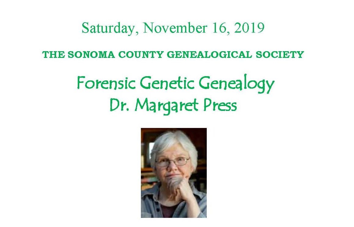 Saturday, November 161 PM - 2:30 PM Finley Center, Santa Rosa Dr. Margaret Press, co-founder of the DNA Doe Project, an organization with the mission to identify John and Jane Does using genetic genealogy, will share some of the challenges and successes the project has had during its first two years. She will also explain the process with a behind-the-scenes look at their first solved case.
