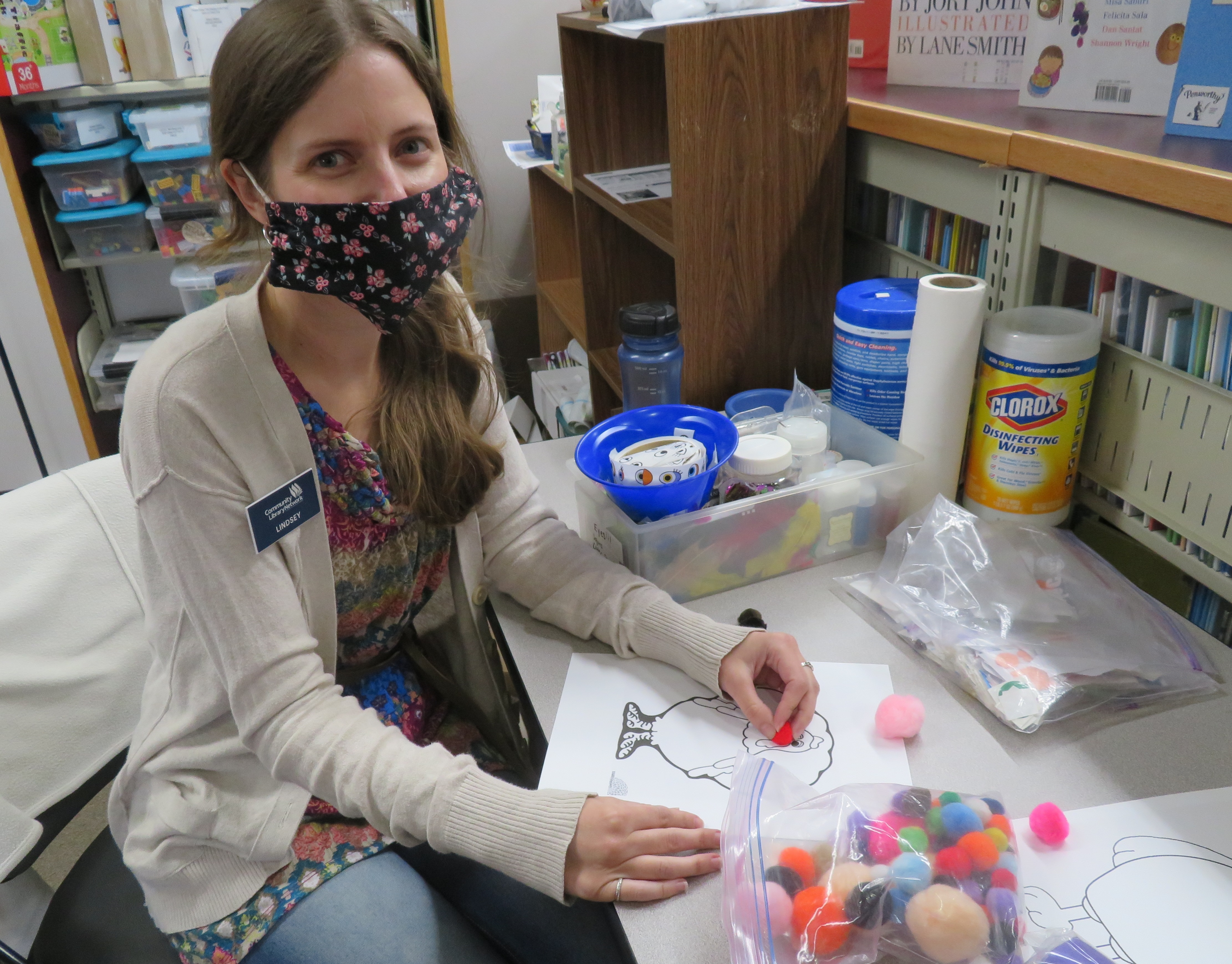 Lindsey is always happy to help Ms. Bethany with Grab 'n Go Kits. Here Lindsey is working on a "Disguise the Turkey" project! It's always good when we have acitivities to work on when the library is quiet 👍. These fun turkey kits are available for pick up.