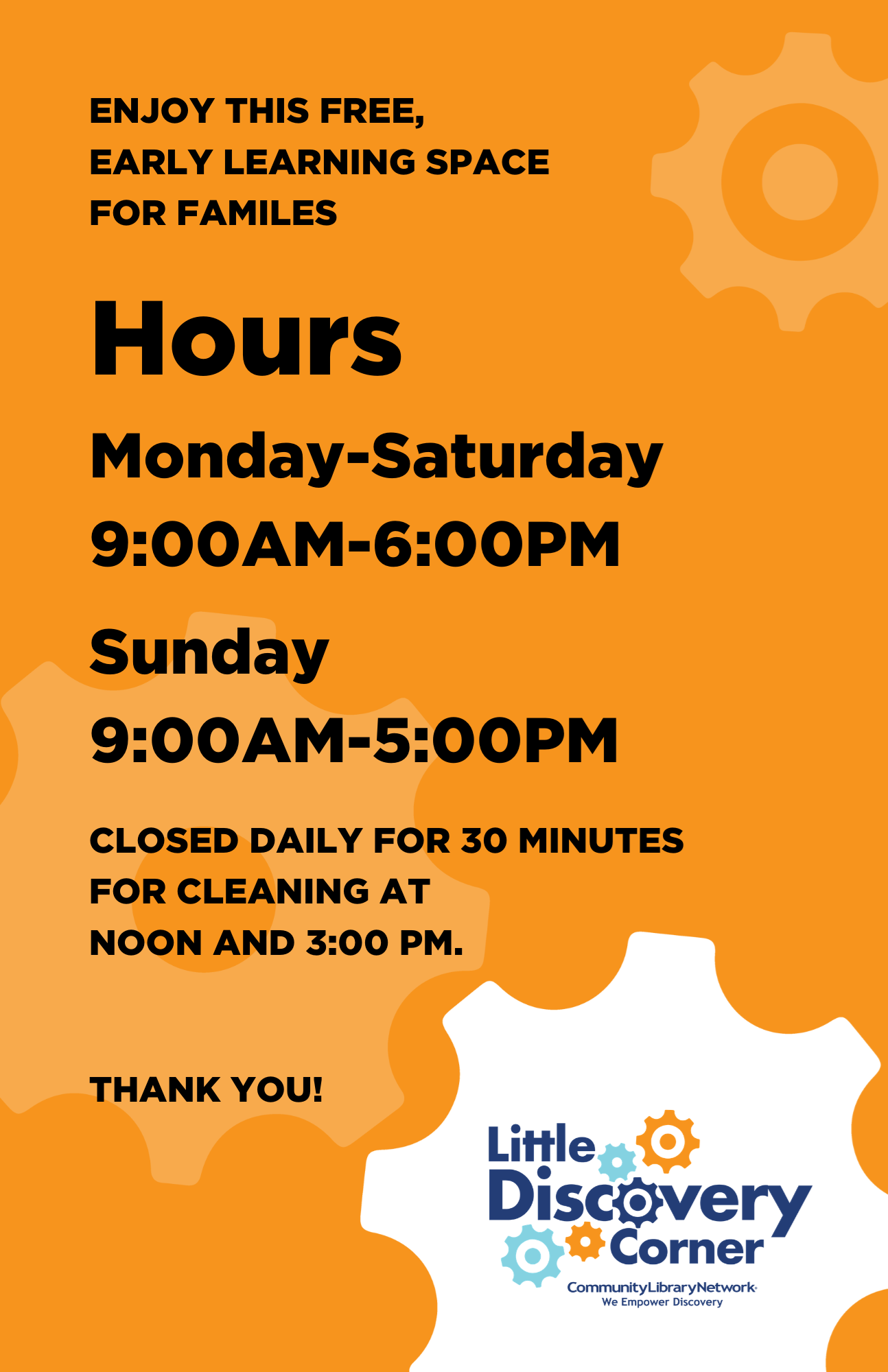 The Little Discovery Corner children's early learning space for families is located in the Silver Lake Mall. Open hours have changed to allow for 30-minute cleaning sessions, twice a day.