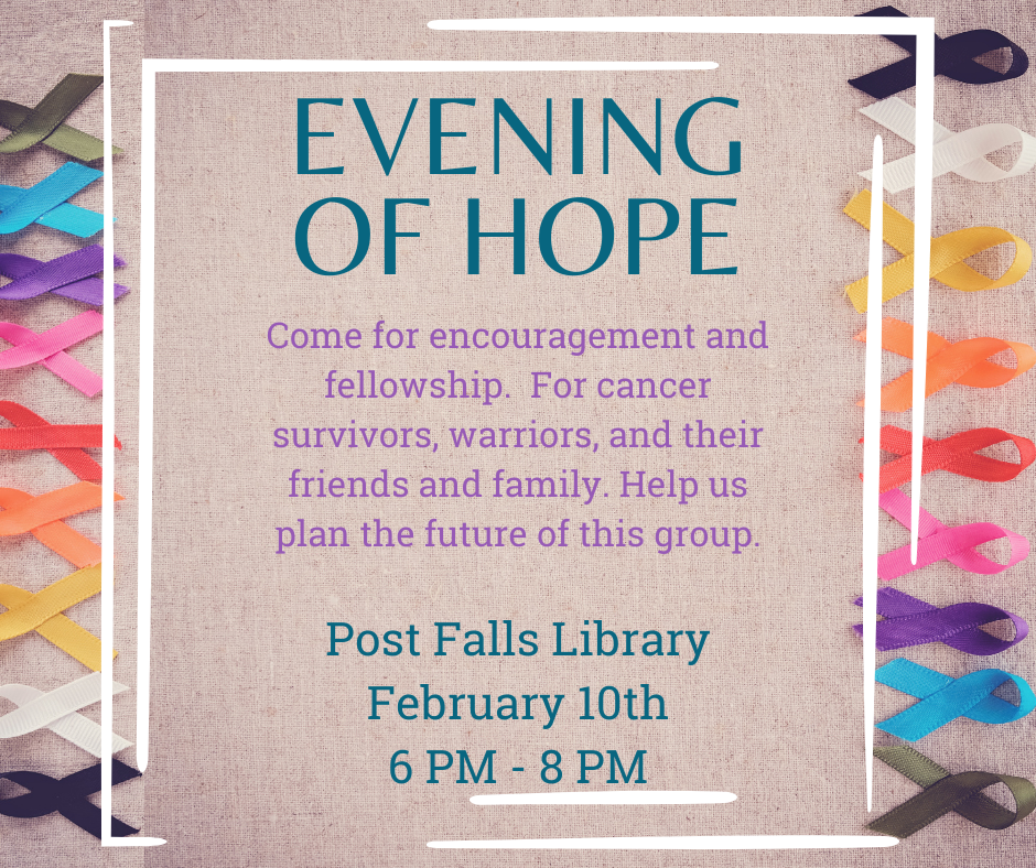 Evening of Hope Post Falls Library Feb. 10th, 6-8 PM An evening of encouragement and fellowship for cancer survivors, warriors, and their friends and family. This is their first meeting in 2 years, come and help plan the future of the group.