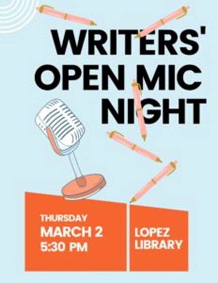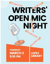 Writers' Open Mic, THU, April 6th, 5:30 - 6:30pm Join fellow writers on the first Thursday of the month to share your written work in a friendly and safe creative space. Participants are encouraged to sign up in advance by emailing Shari Lane (sllane1965@gmail.com), but anyone is welcome to drop in.