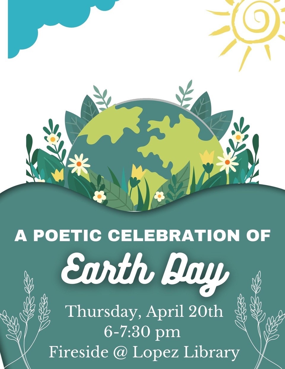 Poet's Pen - WED, April 26th, 5-6pmCome join other local poets for an evening of poetry reading and writing. This month we'll be featuring Earth-based poetry in celebration of Earth Day. The friendly and safe format invites participants to share an inspiring poem of their own or another author's, followed by time for writing/workshopping poems, and closing with brief sharing of the poems in progress. All levels of experience welcome. Facilitated by Nikyta Palmisani and Beth St. George.