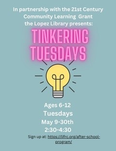 Tinkering Tuesdays May 9th - 30th In partnership with LIFRC (Lopez Island Family Resource Center) and the Lopez Island School, through the 21st Century Community Learning Grant, the Library presents Tinkering Tuesdays, May 9th-May 30th from 2:30-4:30 in the community room. We will be finding fun with lots of parts and pieces from Legos to Marble Runs and making How-To Books and videos. Sign up at https://lifrc.org/after-school-program/.