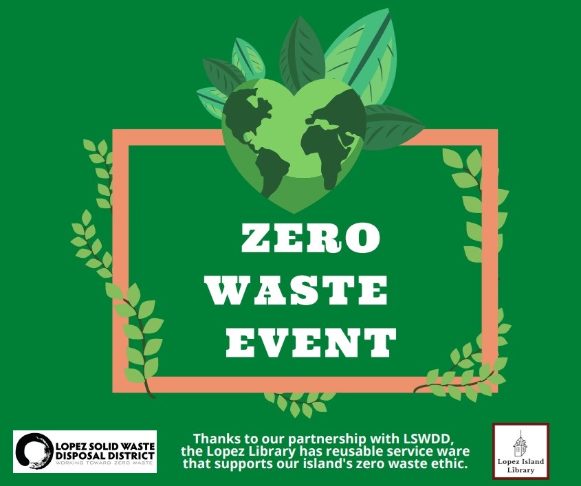Zero Waste Events The Lopez Library has partnered with the Lopez Solid Waste Disposal District to ensure library events are in alignment with Lopez Island’s zero waste ethic. Now events hosted by the library have a lovely set of white and glass service ware, metal utensils, and ceramic serving ware. Simple changes like these both reduce landfill waste and promote reusability with style and elegance. Look for the “Zero Waste Event” sign at the next library event where food or drink are served. |